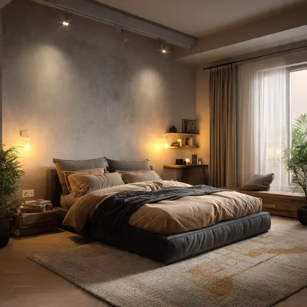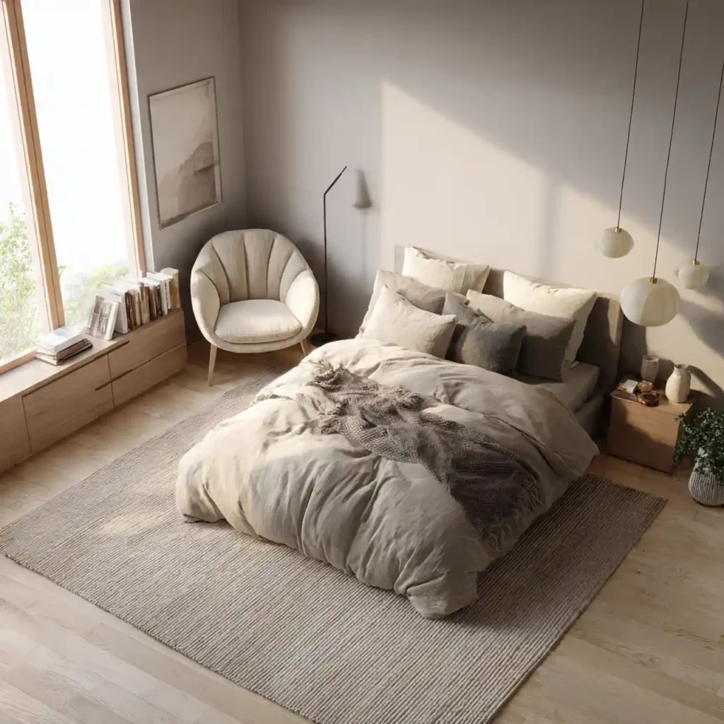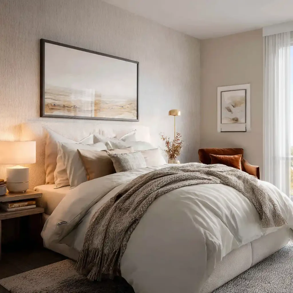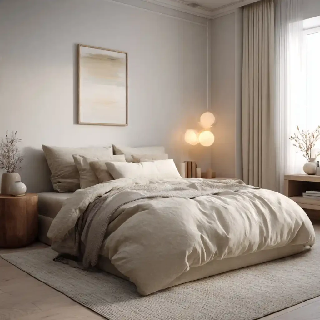 The final idea combines all elements of calm design. Soft lighting, neutral tones, and layered textures work together. Furniture is arranged for easy movement. Décor remains minimal and meaningful. The bedroom feels peaceful, cozy, and perfectly styled.