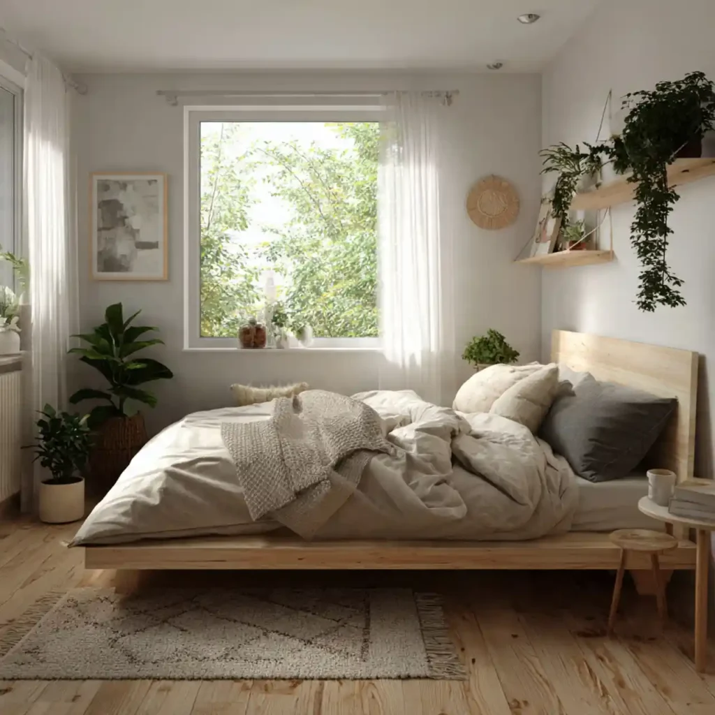 Clean lines and light wood tones define this trendy Scandinavian-style bedroom. A simple platform bed keeps the look modern and airy. White walls and neutral fabrics promote visual calm. Small indoor plants add freshness and life. The room feels balanced, cozy, and effortlessly stylish.