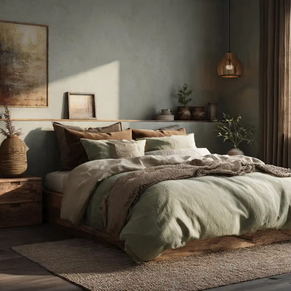 Natural earthy shades create a grounding bedroom atmosphere. Warm browns, soft greens, and muted creams blend harmoniously. Linen bedding and woven rugs enhance texture. Wooden furniture adds organic charm. This space feels cozy, natural, and beautifully on-trend.