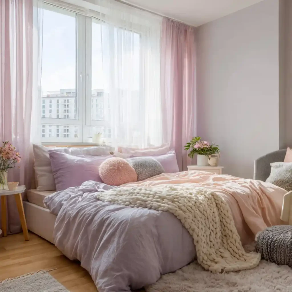 Gentle pastel colors give this bedroom a trendy yet calming personality. Light pink or lavender accents keep the vibe cheerful. Simple furniture prevents visual overload. Soft curtains and plush bedding add comfort. The overall feel is cozy, sweet, and relaxing.