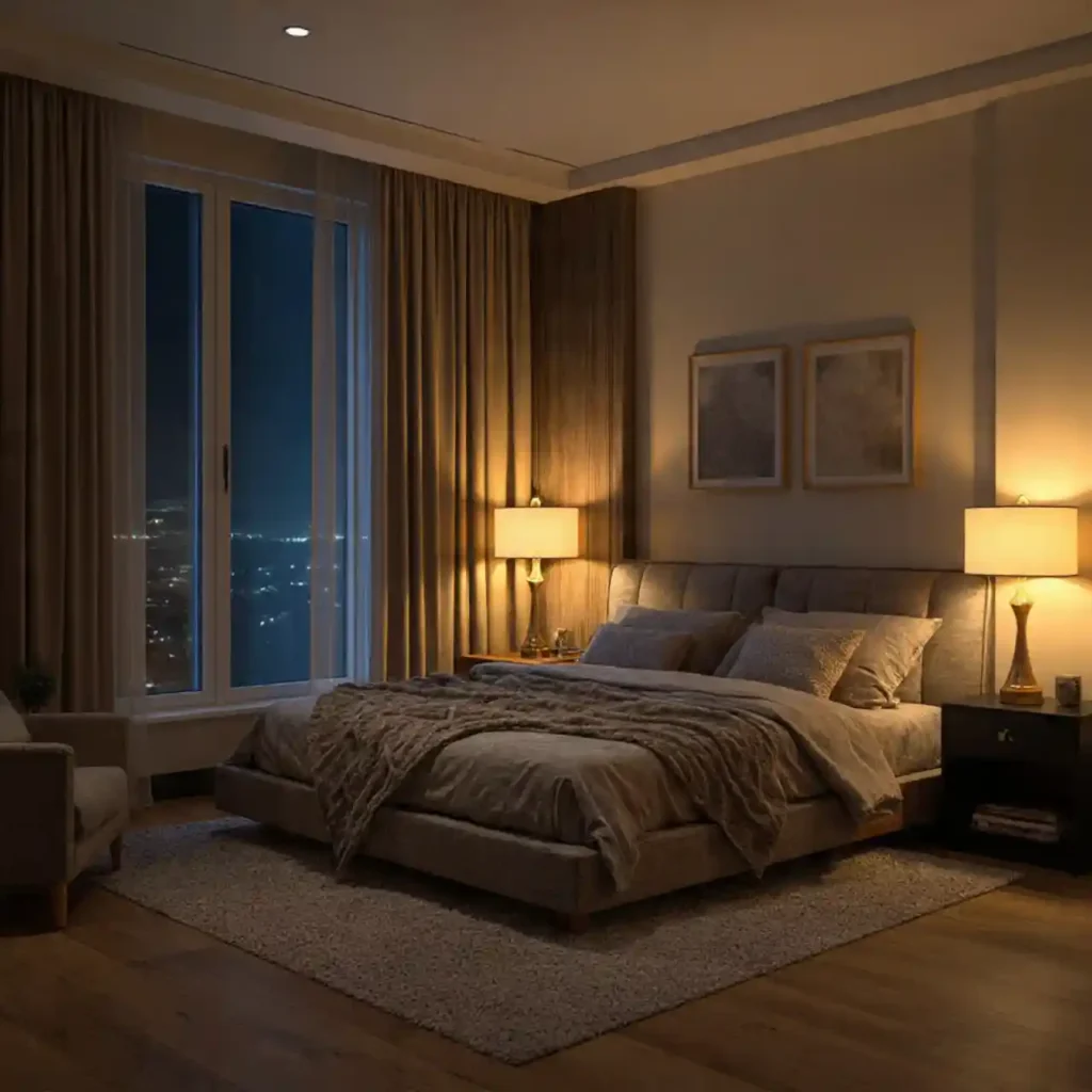 This bedroom focuses on creating comfort through gentle lighting. Bedside lamps and hidden LED strips provide a soft ambient glow. Neutral bedding reflects warmth and enhances coziness. Curtains filter outside light for a peaceful mood. The space feels modern, intimate, and perfect for unwinding.