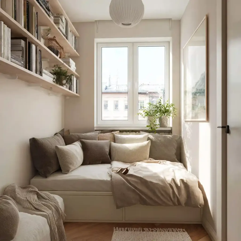 Even small bedrooms can feel calm and stylish. Smart furniture placement keeps the layout open. Light colors make the room feel larger. Soft fabrics bring warmth into the compact space. The design proves that cozy vibes don’t need big rooms.