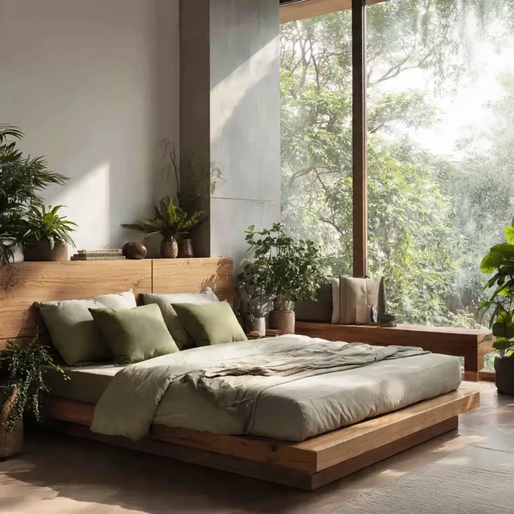 This concept brings outdoor serenity inside the bedroom. Natural wood furniture pairs with green accents. Large windows allow natural light to flow freely. Soft neutral bedding keeps the mood gentle. The space feels fresh, peaceful, and deeply relaxing.