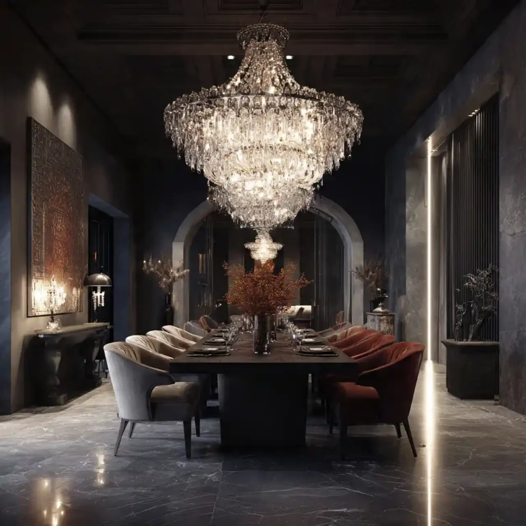 A large crystal chandelier instantly becomes the focal point of a dining room. The sparkling reflections create dramatic highlights across the table and surrounding walls. Paired with a dark wood dining table, the lighting feels luxurious and cinematic. Soft ambient lighting around the room balances the brightness of the chandelier. This setup creates a glamorous dinner atmosphere perfect for elegant gatherings.