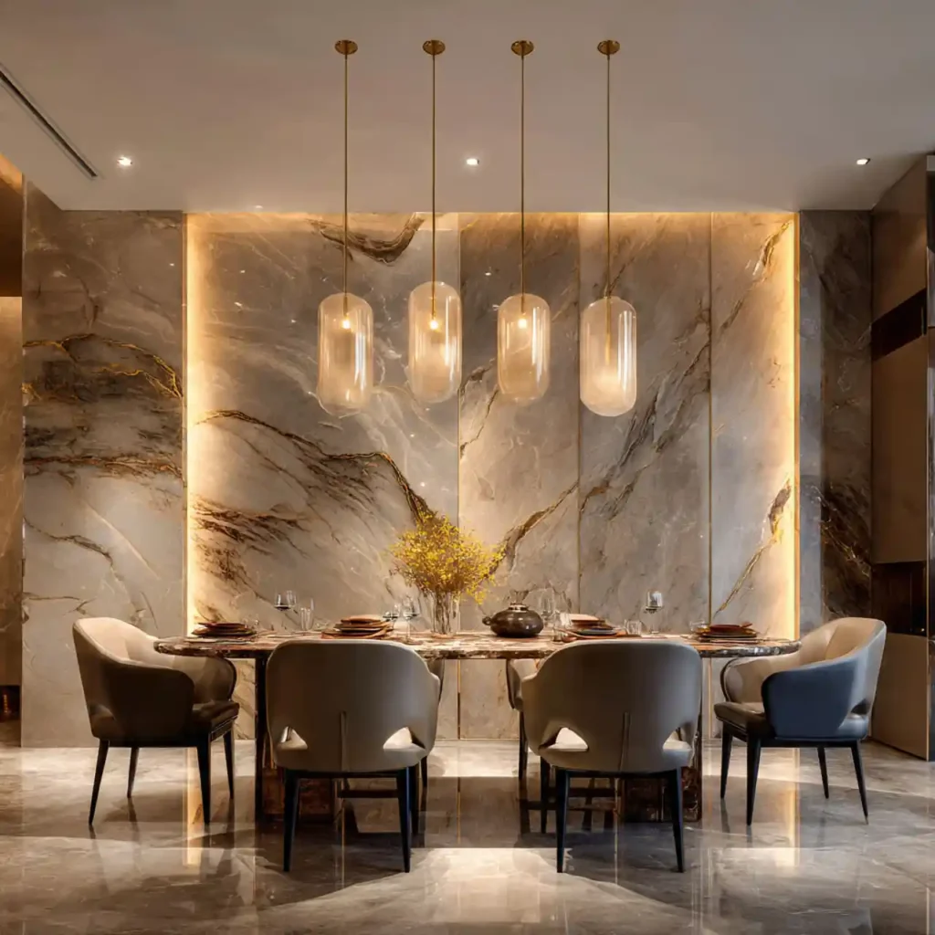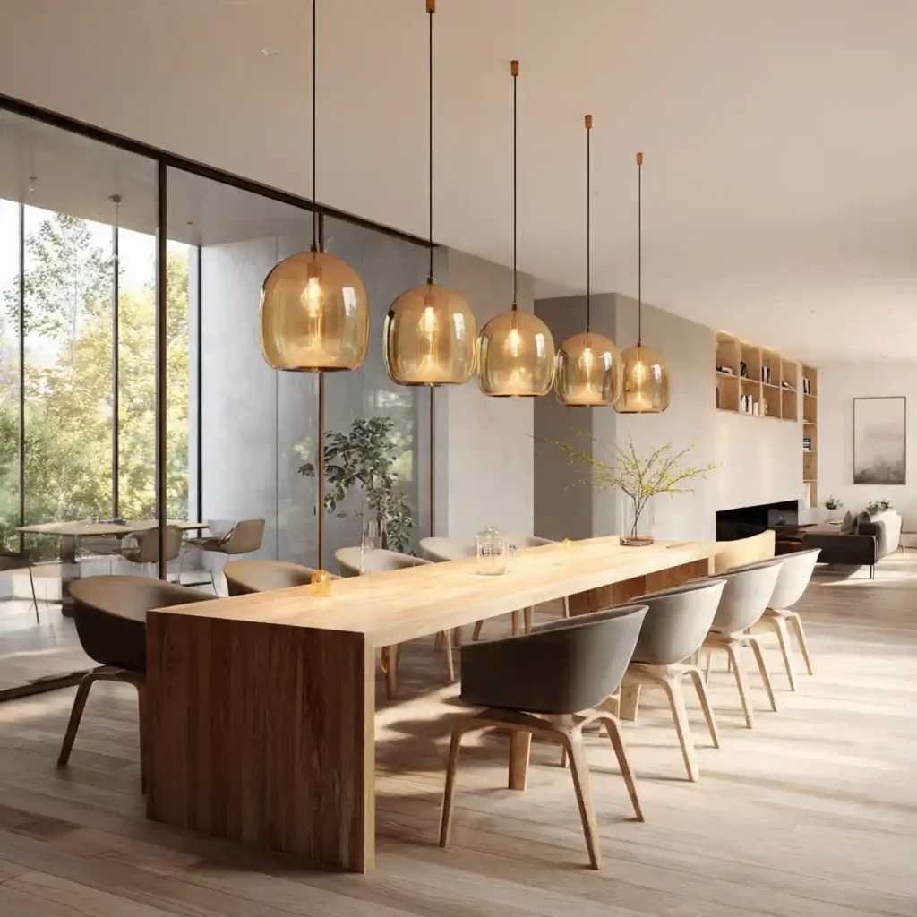 Multiple warm pendant lights hanging over a long dining table create beautiful visual rhythm. The soft golden glow makes the entire room feel intimate and inviting. When the pendants are placed evenly, they guide the eye across the dining space. Minimal decor allows the lighting to remain the hero of the design. This approach gives the dining room a modern yet cinematic mood.
