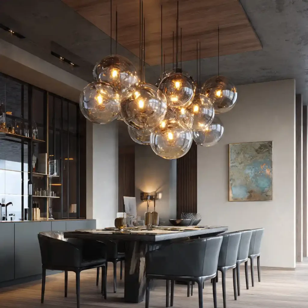 A cluster of glass globe lights creates beautiful reflections in the room. The transparent globes allow light to spread evenly. Their arrangement adds sculptural elegance to the ceiling. The glow feels soft yet visually striking. This design feels luxurious but still modern.