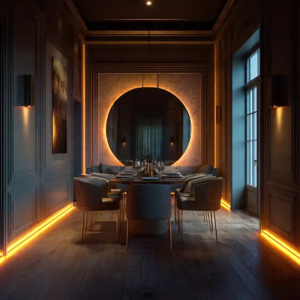 Backlit panels behind the dining area create a glowing architectural feature. The soft light highlights textures and patterns on the walls. This indirect lighting makes the space feel sophisticated. Paired with a simple dining table, the effect feels elegant and modern. The glowing backdrop adds cinematic depth.