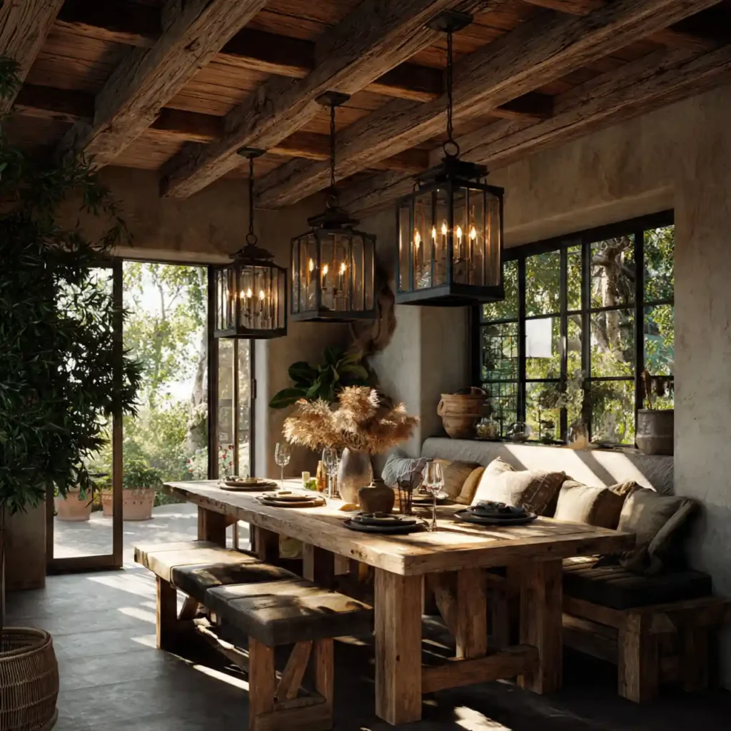Lantern-style lighting adds character and warmth to the dining space. The soft light feels cozy and nostalgic. Wooden beams and natural textures complement the lighting perfectly. Shadows from the lantern frames create beautiful patterns. This style feels warm and welcoming.