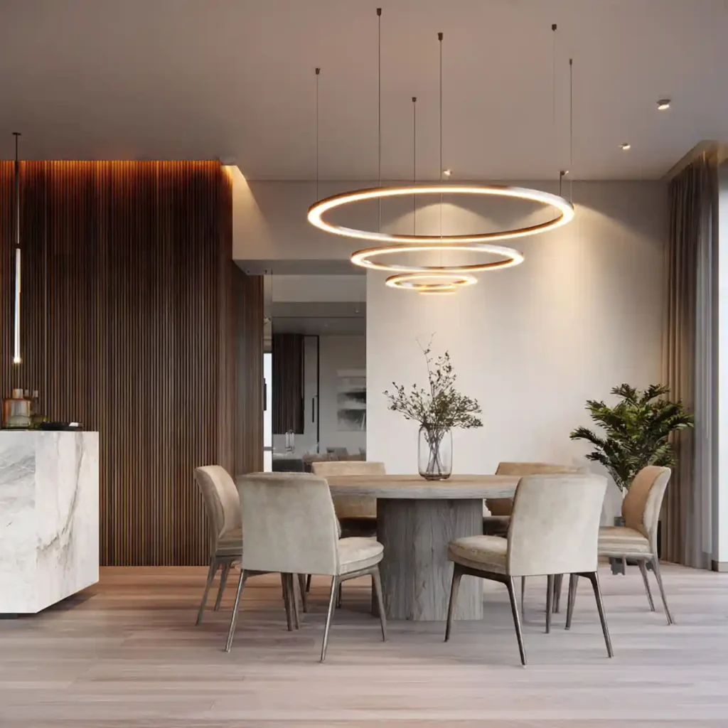 Halo-style ring chandeliers create a floating light effect. The circular design adds modern elegance to the room. The soft light spreads evenly without harsh shadows. This minimalist lighting keeps the focus on the dining experience. It creates a calm cinematic ambiance.
