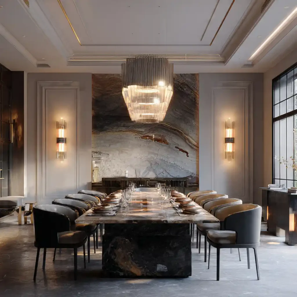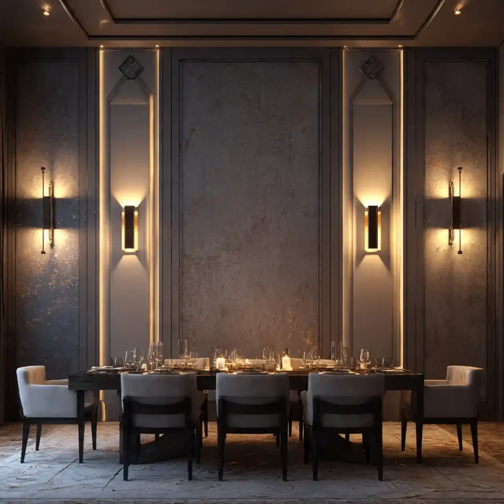 A combination of chandelier, wall lights, and accent lighting creates visual drama. Each layer adds depth to the dining room. This balanced lighting approach prevents the room from feeling flat. Warm tones make the environment feel comfortable. The overall look feels rich and cinematic.