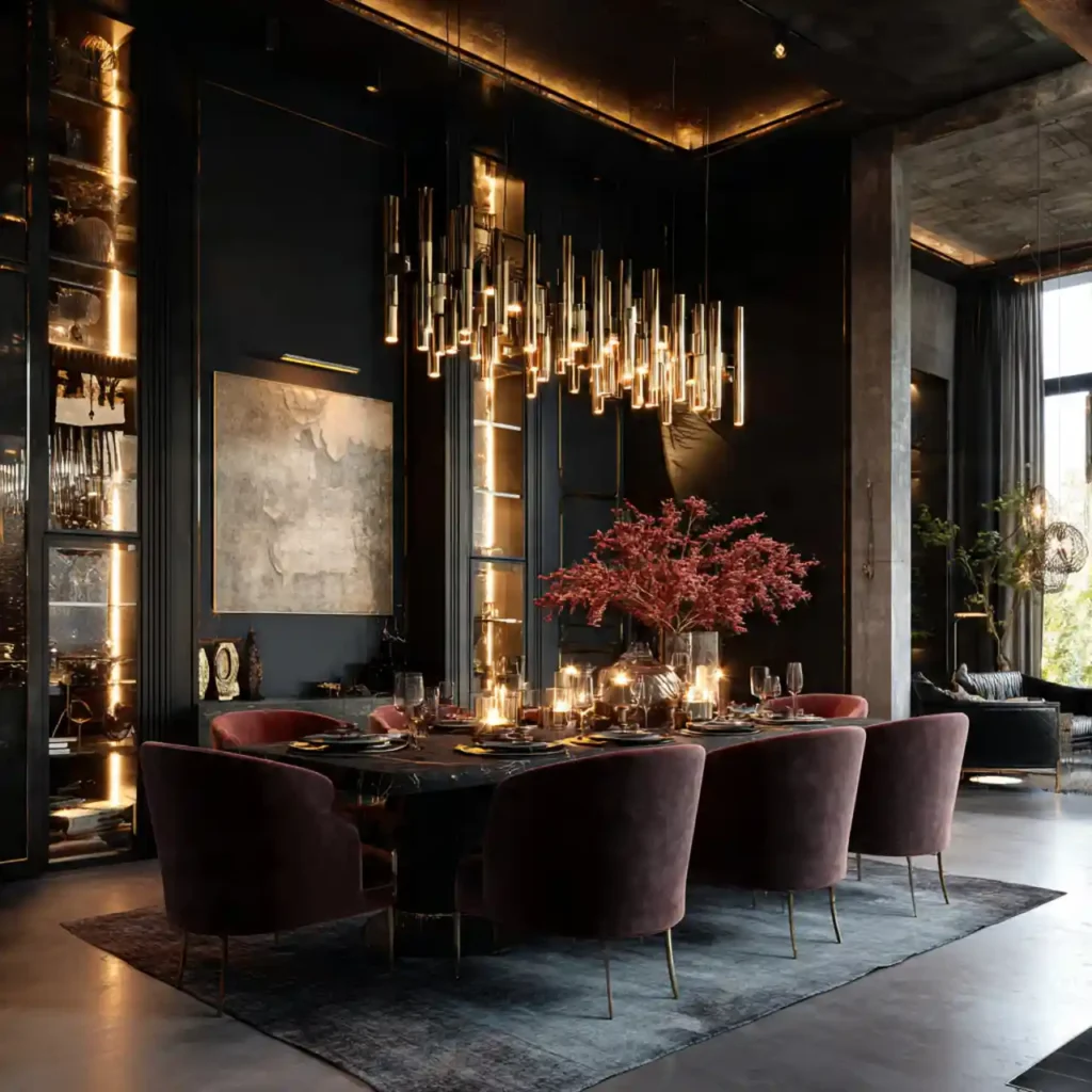Dark walls combined with warm golden lighting create high contrast drama. The lighting highlights the dining table beautifully. Metallic fixtures reflect light in a luxurious way. This design feels bold and sophisticated. It creates a true cinematic dinner setting.