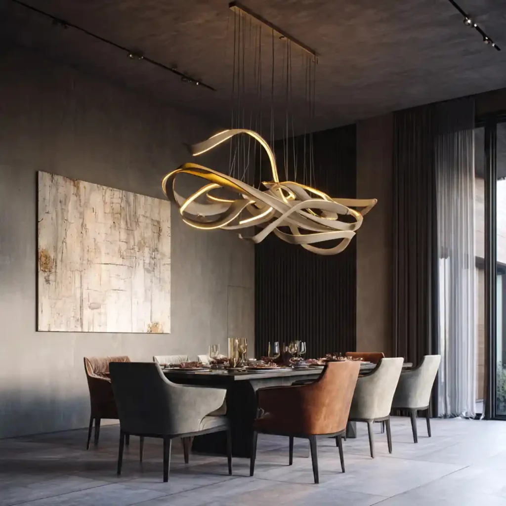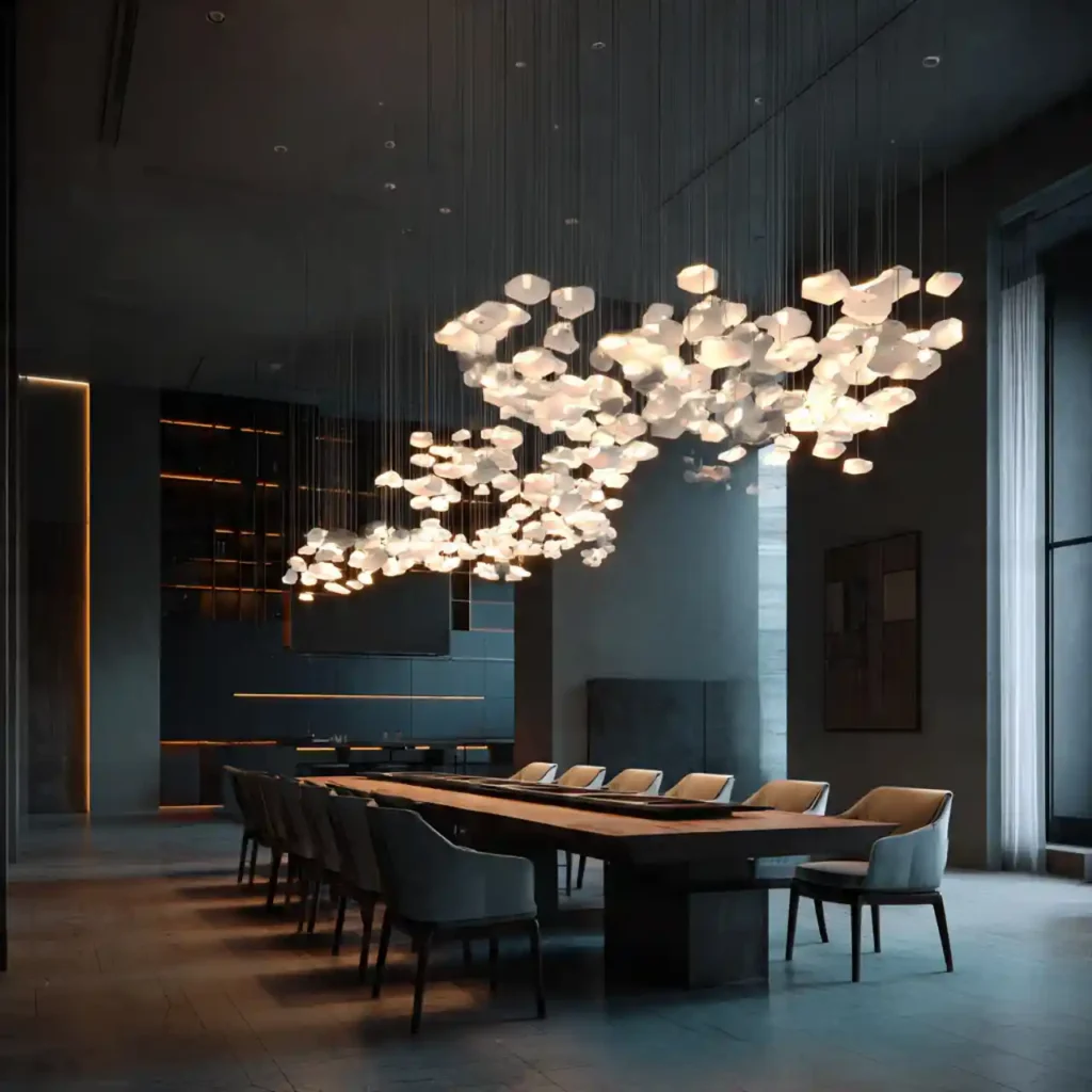 A sculptural chandelier adds both lighting and artistic character to the dining room. The unusual shapes create interesting shadows across the walls and table. When combined with minimalist furniture, the chandelier becomes the centerpiece. Soft lighting enhances the artistic feel of the space. This style feels like a modern design gallery.