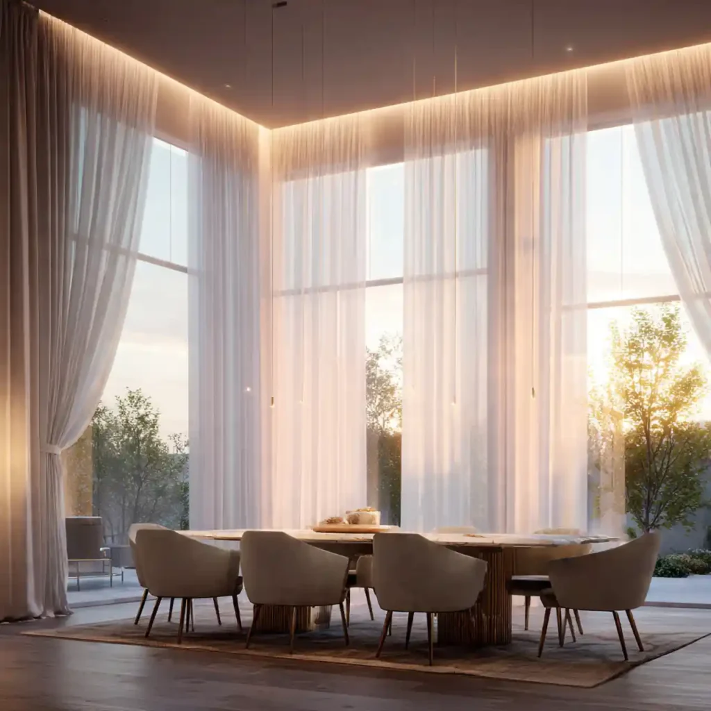 Hidden lighting behind sheer curtains creates a dreamy atmosphere. The diffused glow makes the room feel soft and elegant. When combined with a chandelier, the lighting layers feel magical. This style works well in luxury dining interiors. The overall vibe feels romantic and cinematic.