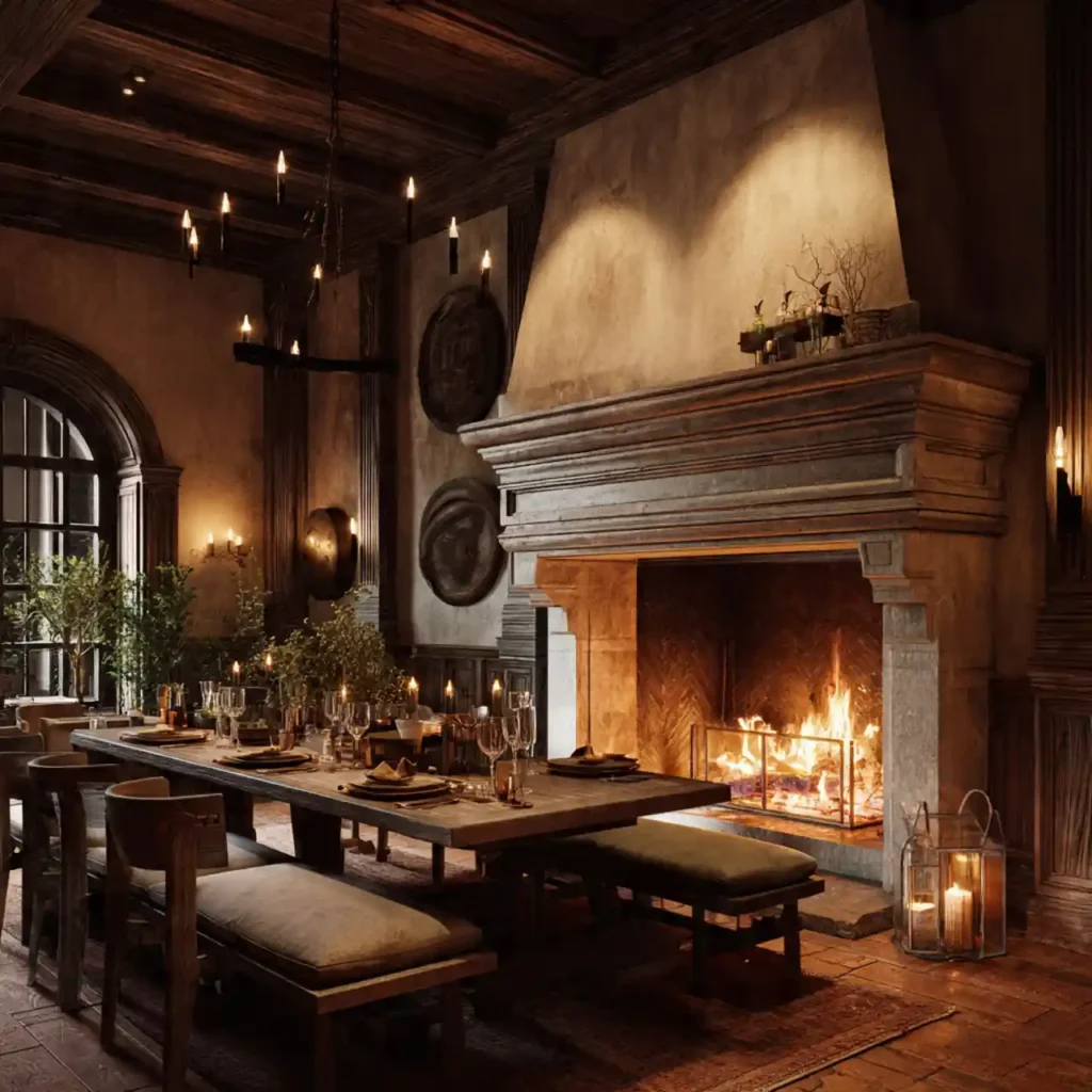 A dining room with a fireplace naturally creates dramatic lighting. The flickering flames add warmth and movement to the space. Combined with soft overhead lighting, the atmosphere feels cozy. The fire becomes a natural focal point during dinners. This setting feels intimate and unforgettable.