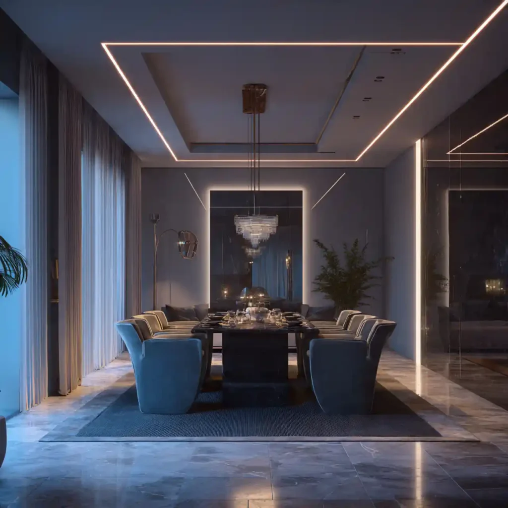 Cove lighting installed in ceiling edges creates a soft glowing frame around the room. The indirect lighting adds depth without overpowering the dining table area. When paired with a central chandelier, the layered lighting feels sophisticated. The subtle glow enhances architectural details in the room. This creates a calm yet dramatic dining atmosphere.
