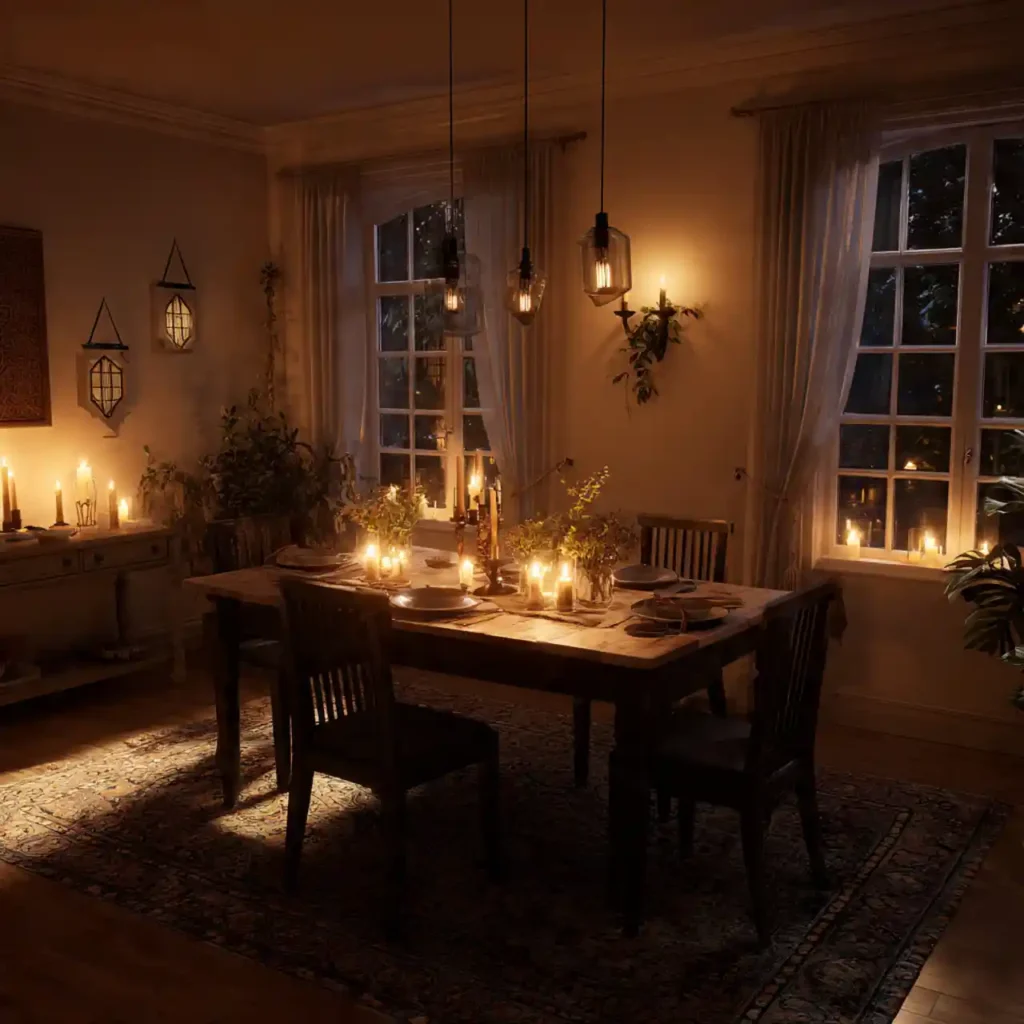 Layered lighting that mimics candlelight creates a romantic cinematic mood. Small pendant lights and wall sconces provide warm glowing illumination. A wooden dining table enhances the cozy atmosphere. Soft shadows create a beautiful sense of depth around the room. This setup feels perfect for intimate evening dinners.