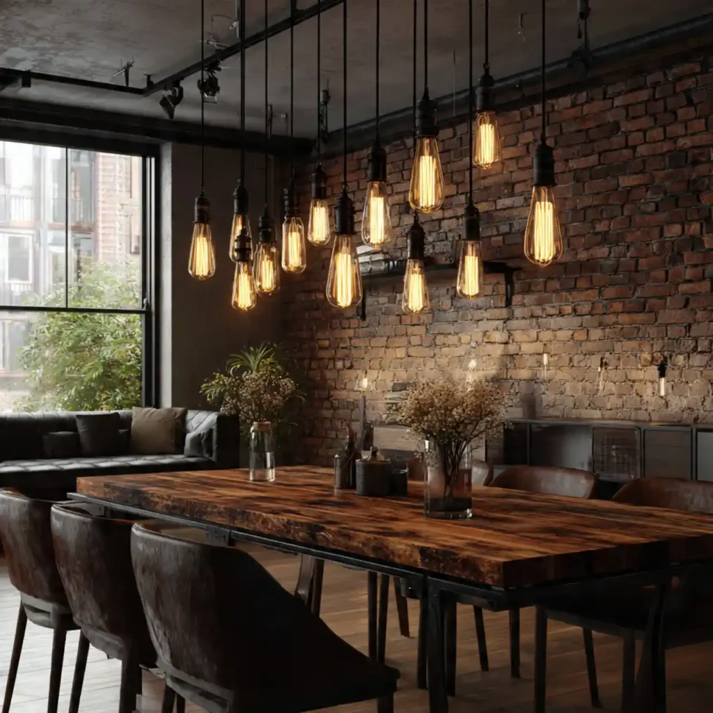 Exposed Edison bulbs bring vintage charm and dramatic shadows. Their warm amber glow creates a cozy cinematic atmosphere. Industrial metal fixtures complement wooden dining tables perfectly. The slightly dim lighting makes the room feel intimate and relaxed. This style works great for loft-style interiors.