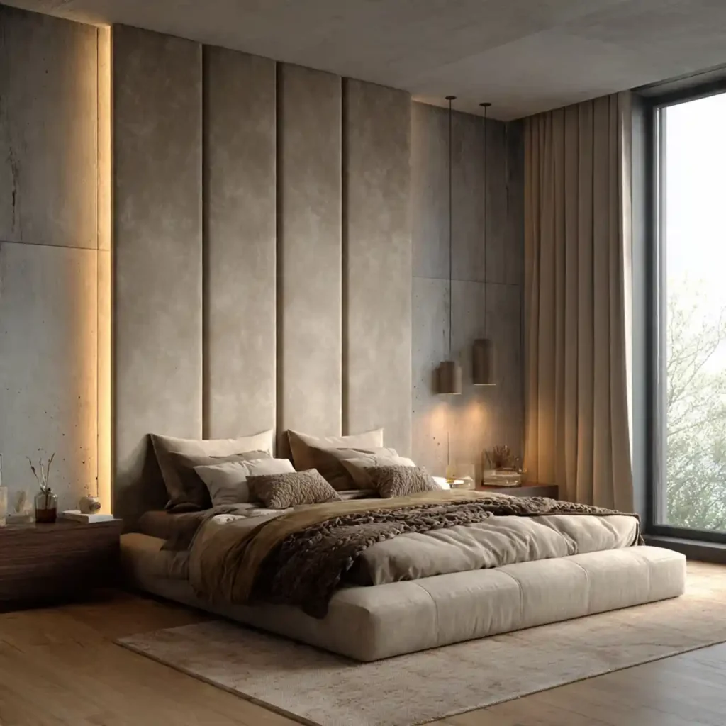 An oversized upholstered headboard instantly creates a luxury focal point. Extending it to the ceiling adds architectural drama and vertical height. Soft fabrics like velvet or linen enhance texture and warmth. This detail anchors the entire bed wall beautifully. It transforms a basic bed setup into a designer feature.