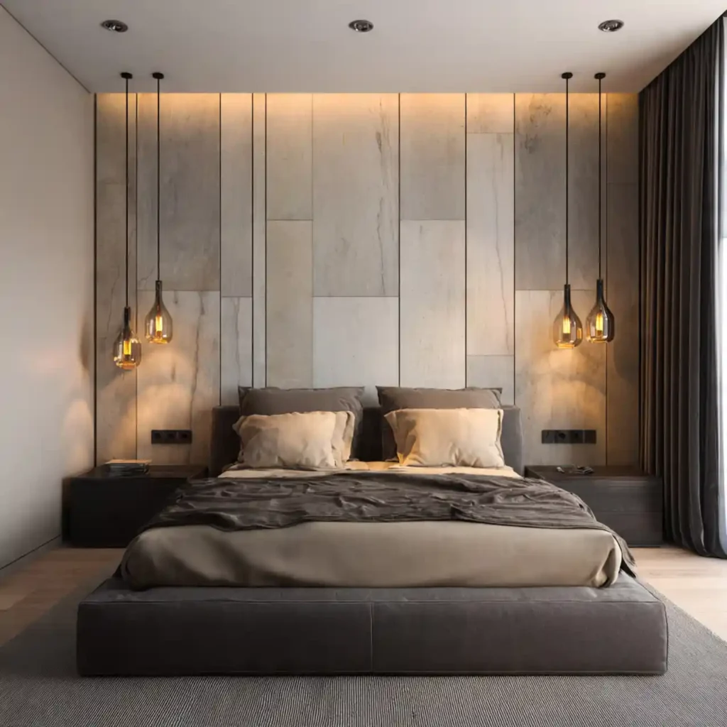 Replacing standard fixtures with sculptural pendants adds drama. Hanging lights on either side of the bed feel modern and bold. Pendant lighting frees up nightstand space. It creates vertical interest and movement. This feature feels curated and custom.