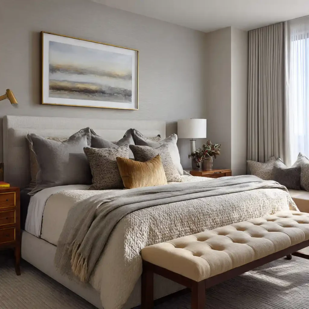 A bench adds function and elegance. Upholstered or wooden designs create contrast. It visually completes the bed area. Designers use it to introduce another layer of texture. This subtle detail enhances luxury appeal.