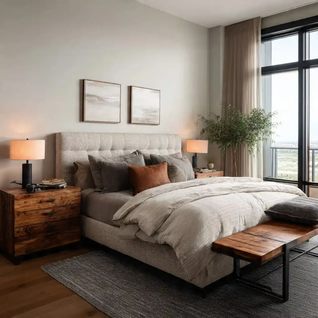 Combining wood, metal, or stone adds layered sophistication. Mixed materials prevent monotony. Designers choose unique finishes for contrast. This small detail makes the bedside area feel styled. It adds visual interest without clutter.