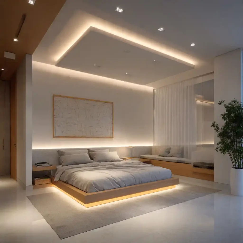Hidden LED strips along ceiling edges create a floating effect. This modern detail adds depth and ambiance. It enhances nighttime atmosphere beautifully. Subtle indirect lighting feels luxurious. It transforms a simple ceiling into a statement.