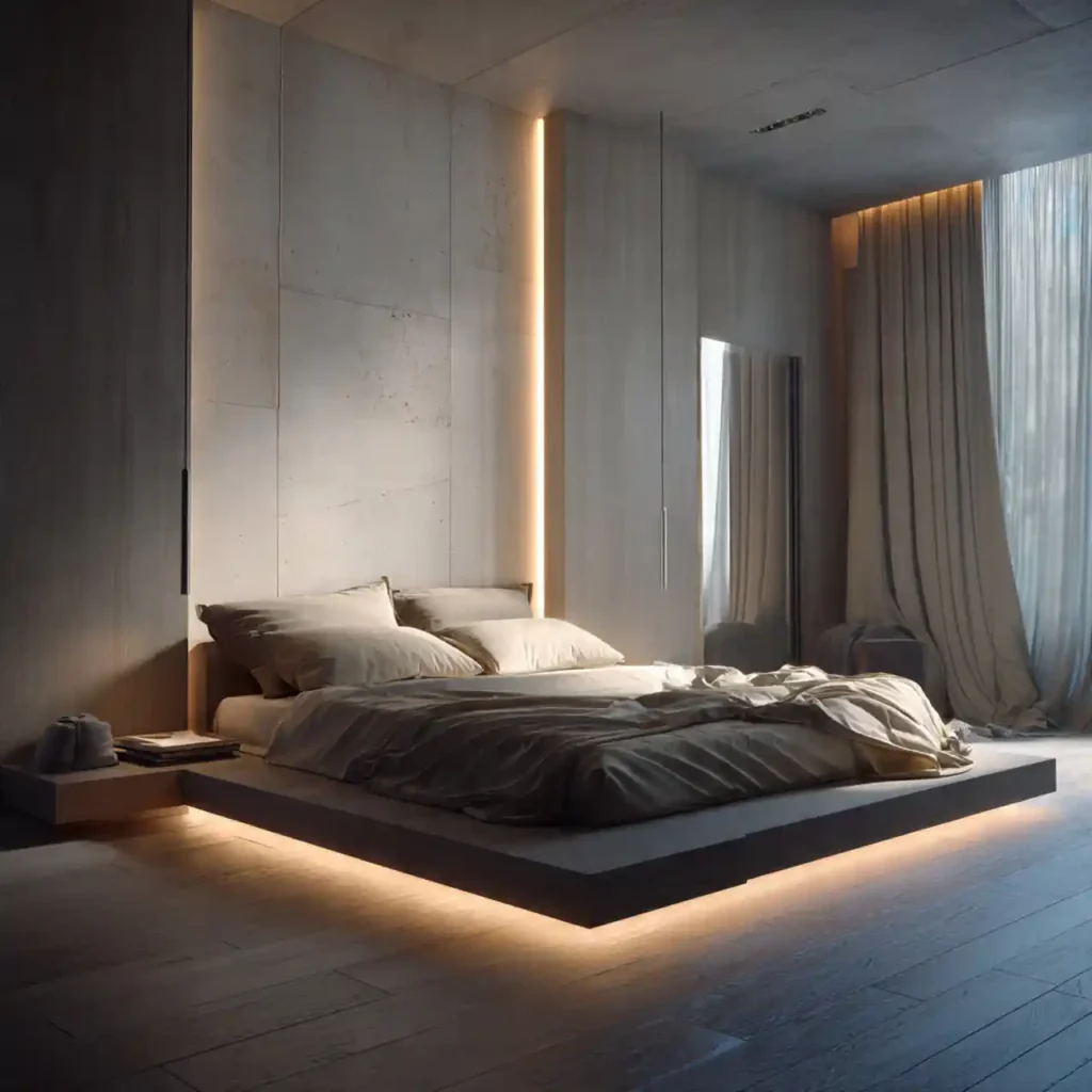 A floating bed creates a modern, airy effect. It visually expands the floor space. Paired with under-bed lighting, it looks futuristic yet cozy. This detail feels custom-built. It enhances the room’s architectural presence.