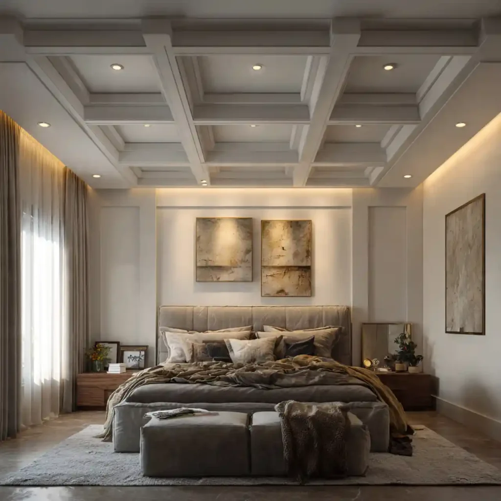 Most bedrooms ignore the ceiling, but designers treat it as the “fifth wall.” Coffered ceilings, wood panels, or a bold paint color add unexpected impact. A detailed ceiling adds depth and personality. It makes the space feel layered rather than flat. Looking up becomes part of the experience.