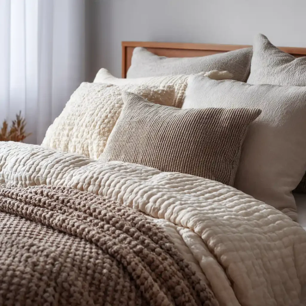 Designers never stop at just a duvet. Layered bedding includes throws, quilts, and varied pillow sizes. Mixing cotton, linen, and knit fabrics adds richness. Texture layering makes the bed feel plush and inviting. It turns the bed into a luxurious centerpiece.
