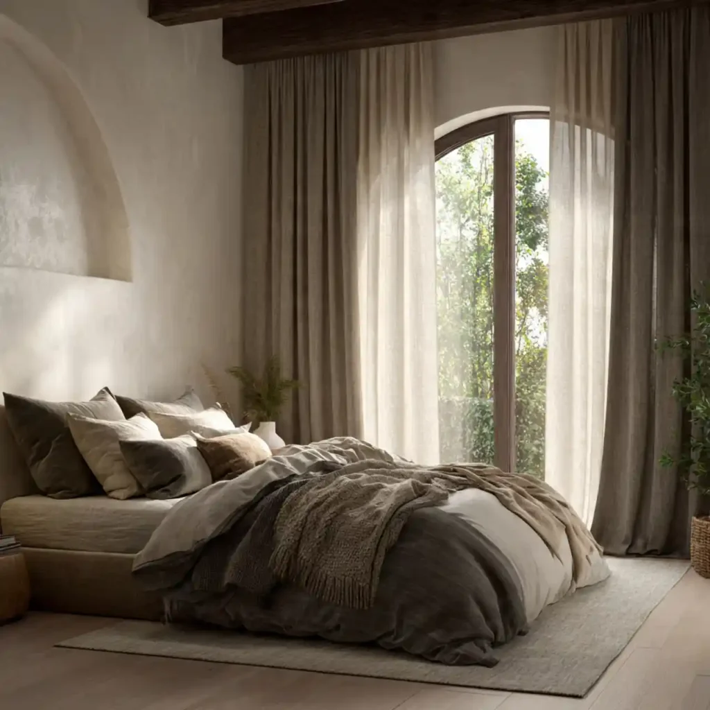Curtains hung high and wide create height and softness. Floor-to-ceiling drapery makes windows feel grand. Linen or velvet fabrics enhance depth. Properly scaled curtains frame the bed beautifully. This detail instantly elevates the entire bedroom.