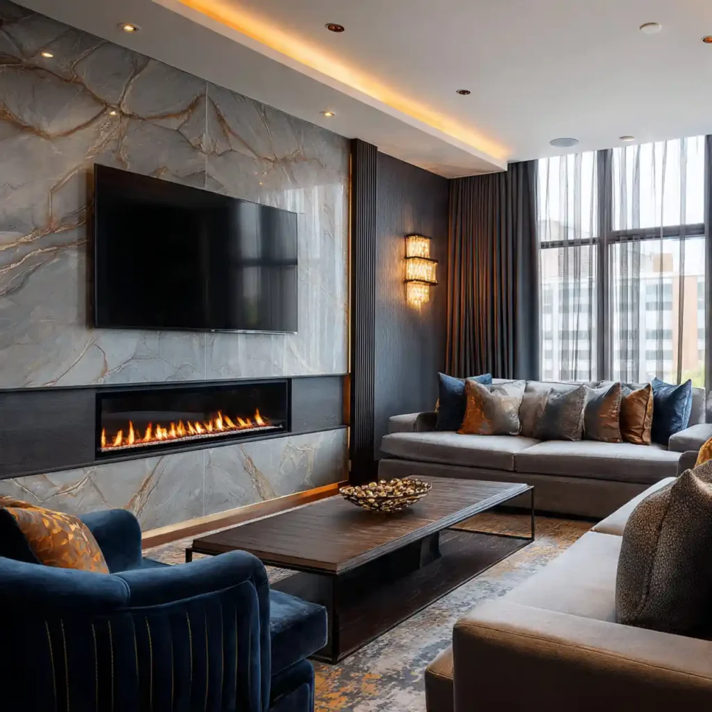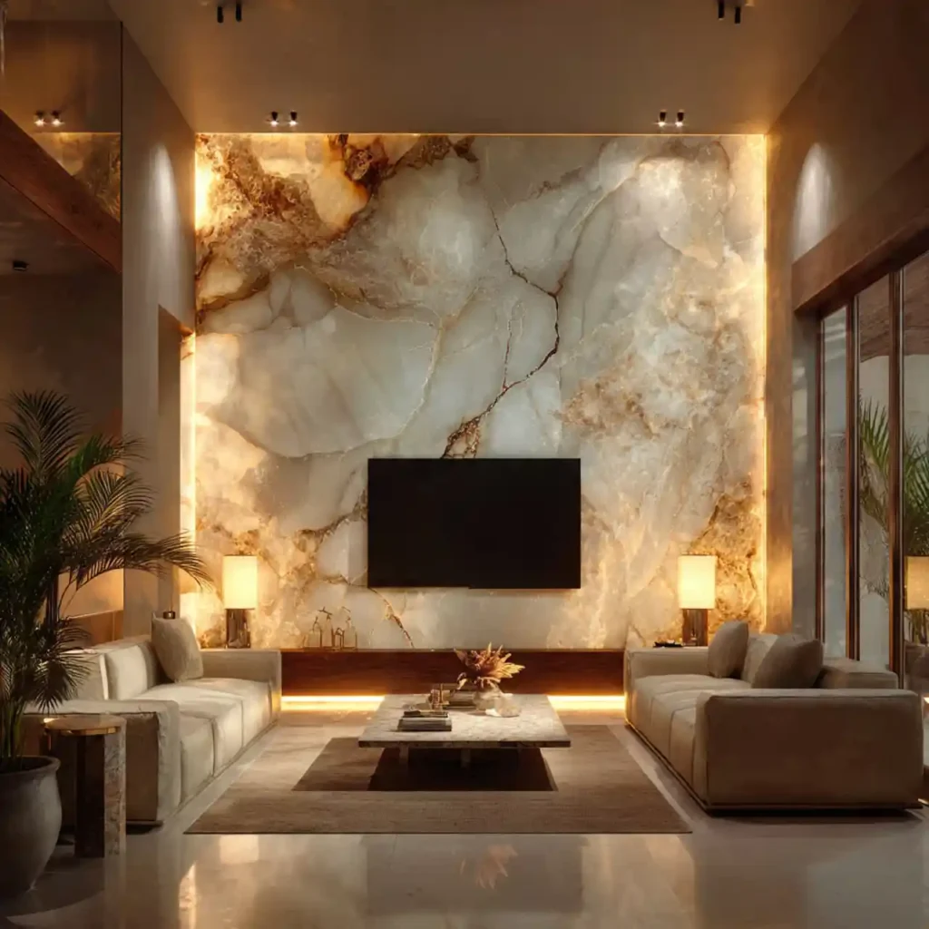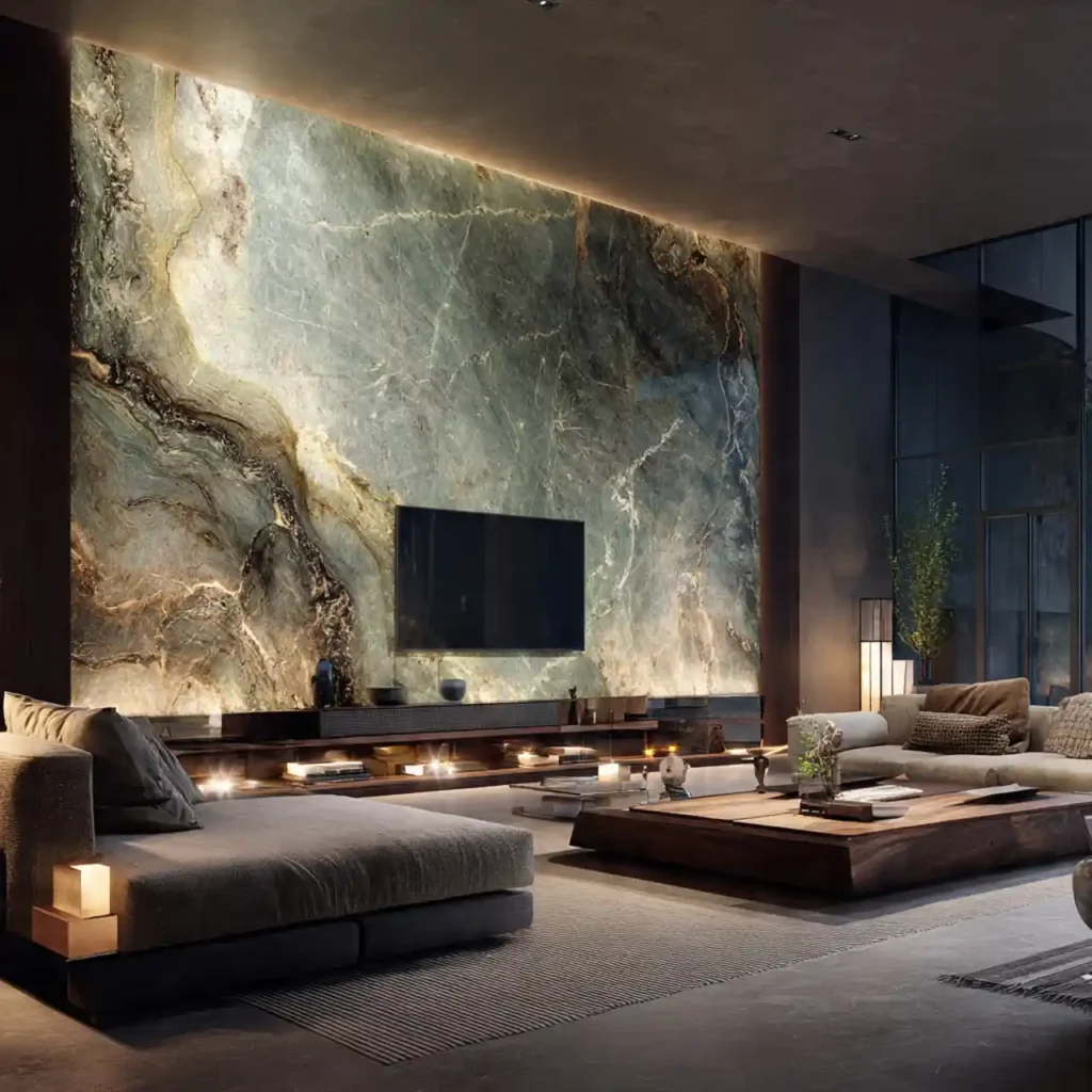 A single stone slab behind the TV creates a dramatic statement. The natural veins act like abstract artwork. Minimal furniture keeps attention on the wall design. Warm lighting highlights the beauty of the stone. This idea adds luxury and uniqueness to the space.