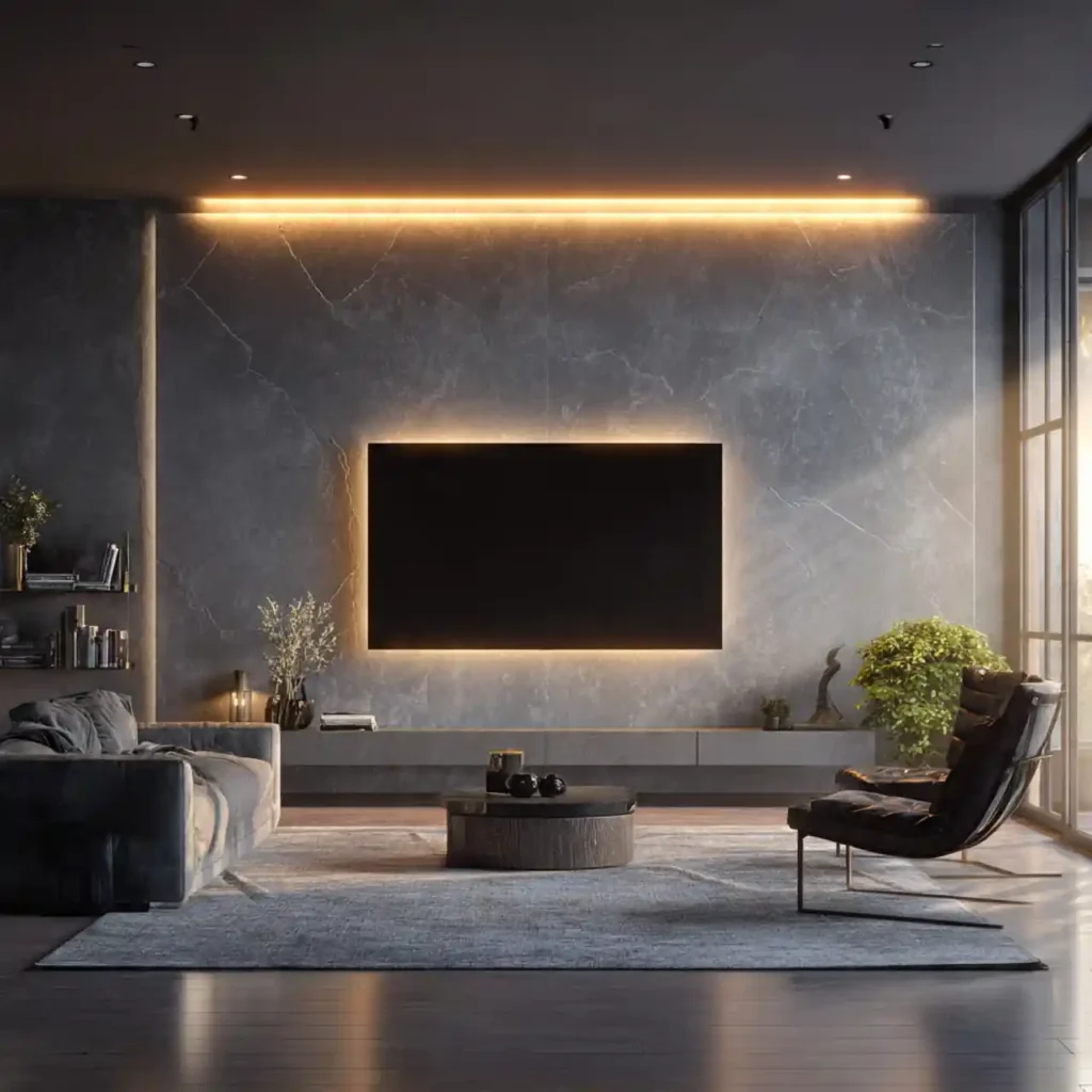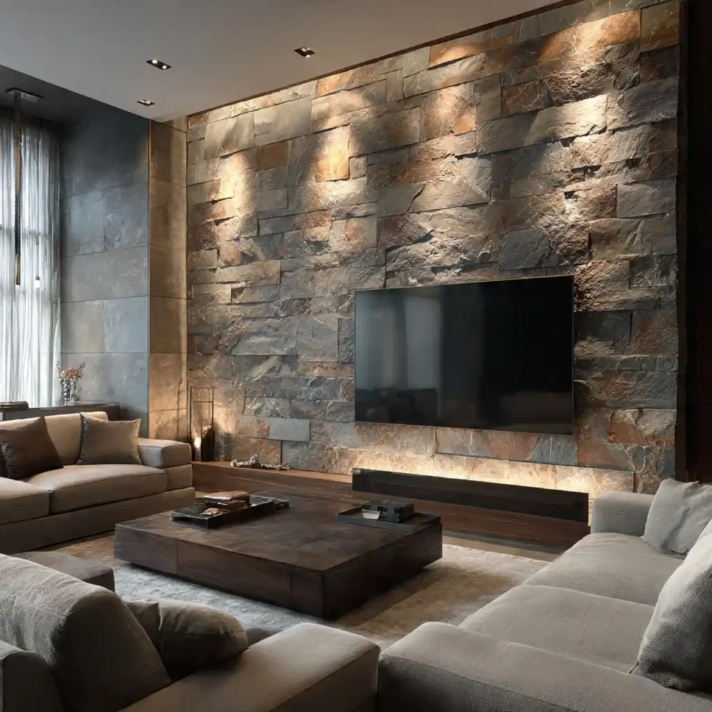 Natural stone surfaces create a bold and dramatic TV backdrop. The rough texture adds depth and character to the room. Warm lighting highlights the details of the stone beautifully. This design works especially well in modern or rustic interiors. It creates a strong focal point in the living room.