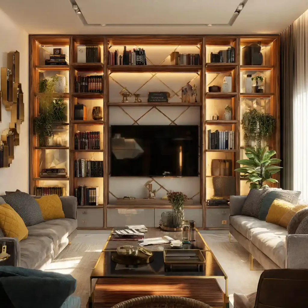 A TV wall with built-in cabinets adds both style and functionality. The shelves allow space for books, decor pieces, and plants. Closed cabinets below help hide cables and electronics. This makes the living room feel more organized and elegant. The design also creates a balanced and custom-built appearance.