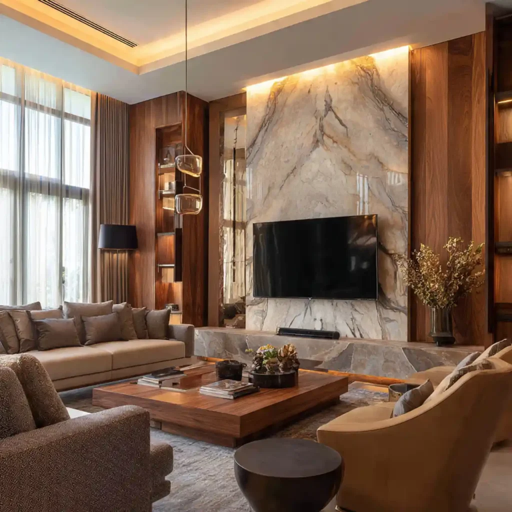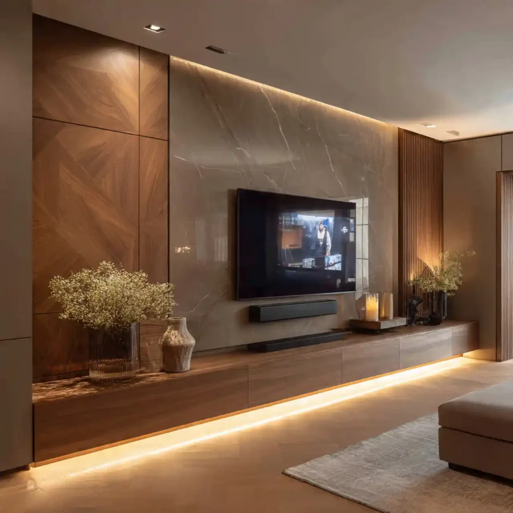 Combining wood and marble creates a luxurious layered effect. The warmth of wood balances the cool elegance of marble. Designers often frame the TV with wood panels. The marble section acts as a dramatic centerpiece. This blend of materials feels both modern and timeless.
