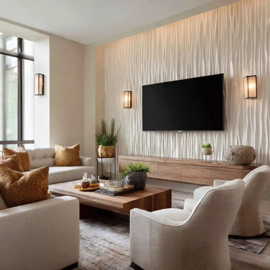 Geometric panels create artistic patterns behind the TV. The shapes add movement and visual interest to the wall. Neutral tones keep the design sophisticated. Lighting highlights the geometric textures beautifully. This idea feels modern and designer-inspired.