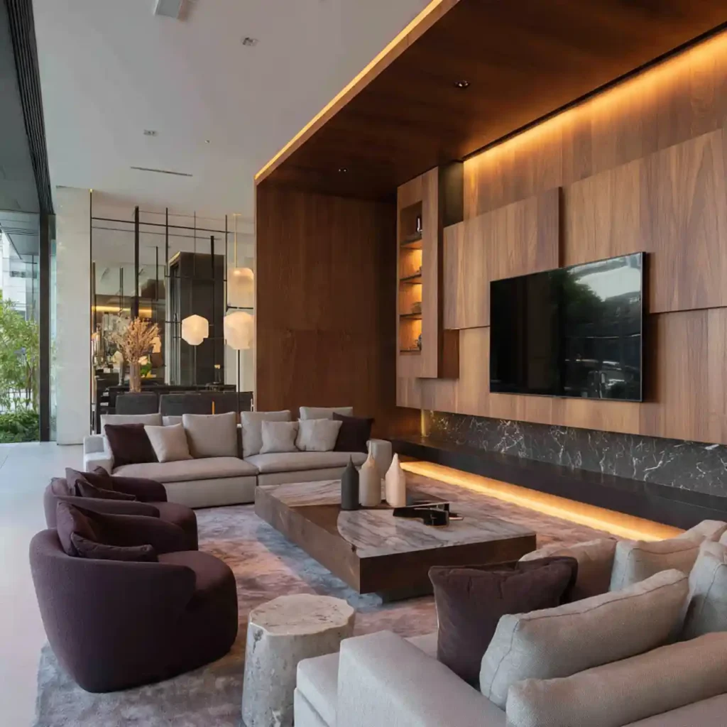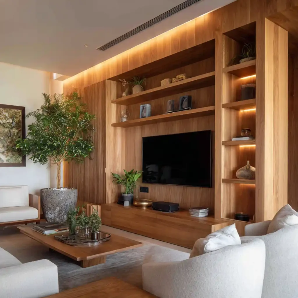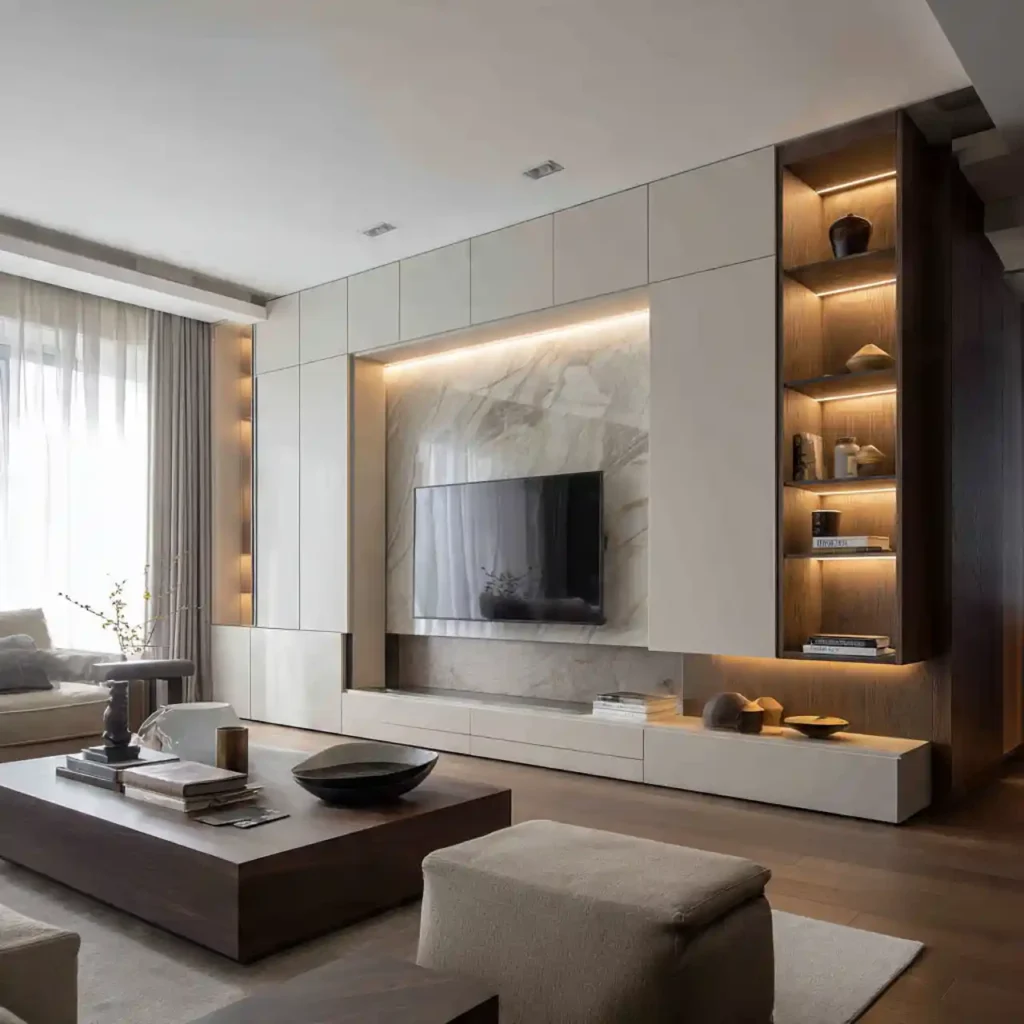 Hidden storage panels keep the TV wall clean and clutter-free. Cabinets blend seamlessly into the wall design. Electronics and accessories remain completely concealed. This creates a minimalist and polished look. The living room feels organized and sophisticated.