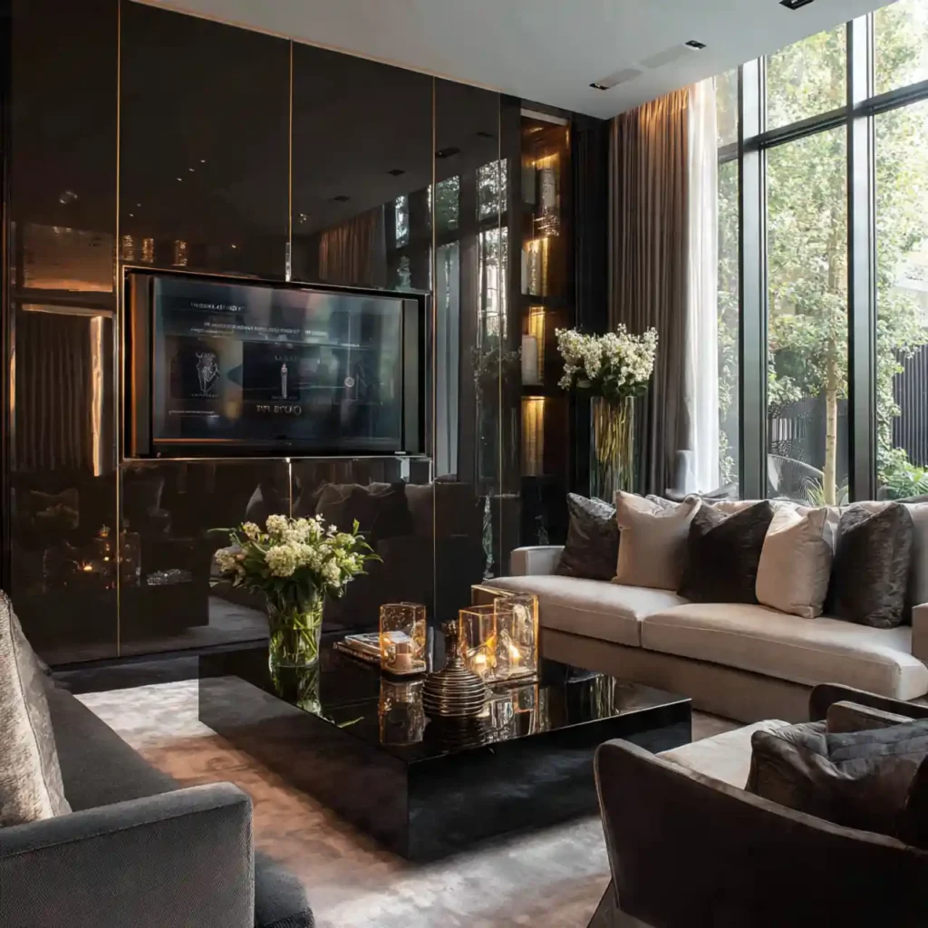 Glass panels can create a sleek and reflective TV wall. The surface reflects light and makes the space feel larger. Dark tinted glass works especially well with modern interiors. LED lighting can enhance the reflective effect. This design feels futuristic and elegant.