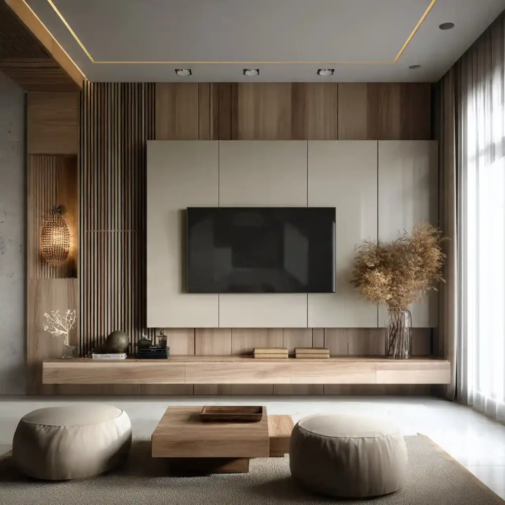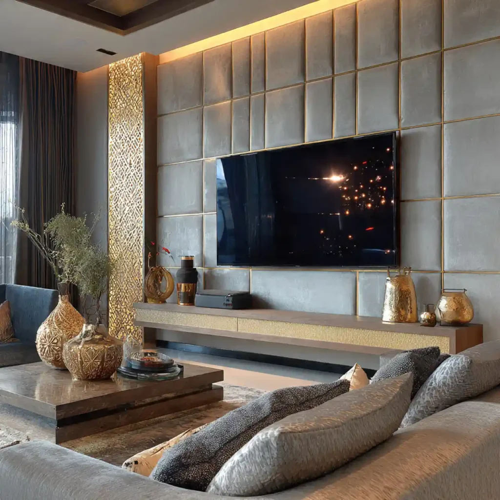 Vertical panels create rhythm and structure behind the TV. They visually increase the height of the room. Materials like wood, MDF, or textured boards can be used. Soft lighting enhances the panel shadows beautifully. This design feels refined and architectural.