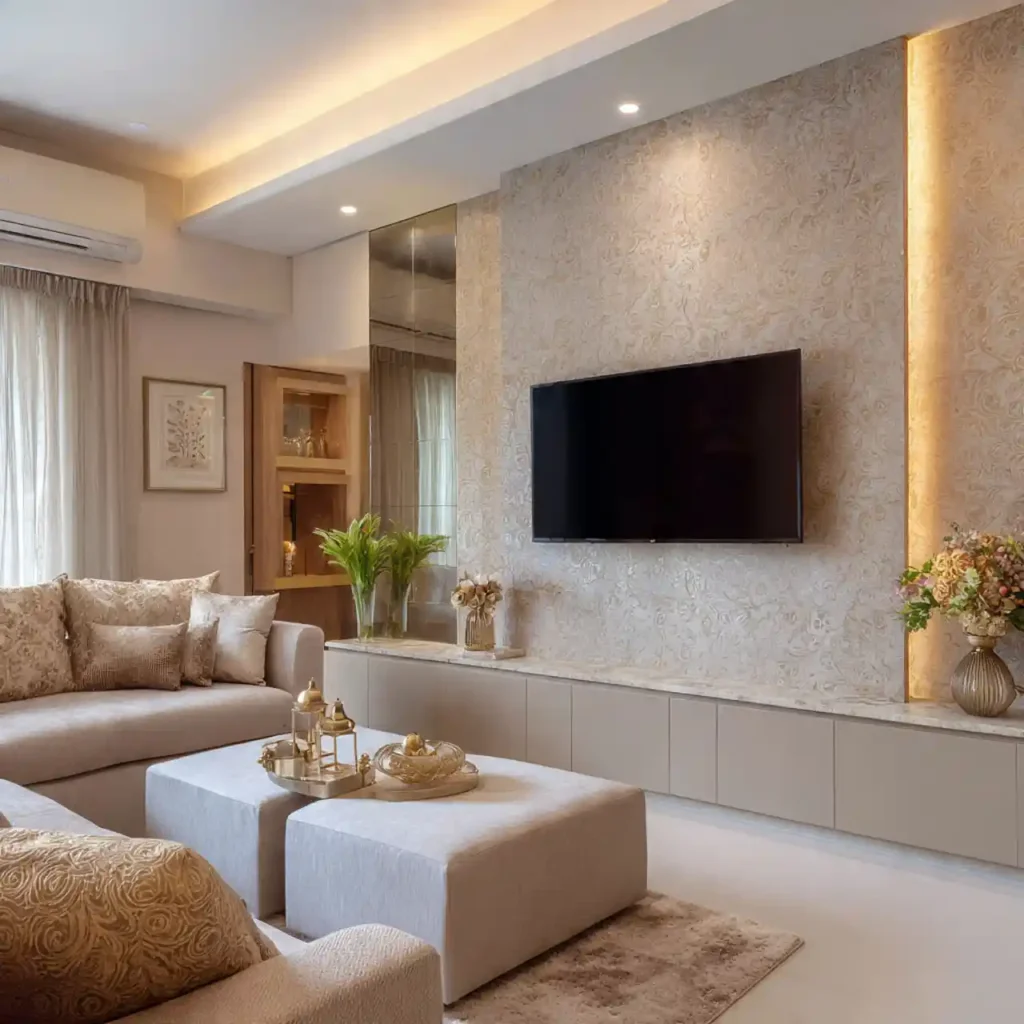 Textured wallpaper can transform a simple TV wall instantly. Patterns such as fabric textures or subtle prints add depth. The wallpaper acts as a stylish background. Minimal decor keeps the design balanced. It creates a refined and elegant living room feature.