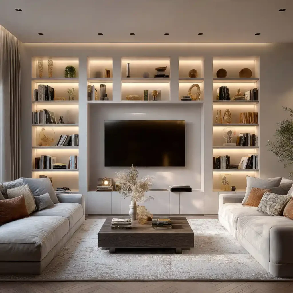 Symmetrical shelves on both sides of the TV create visual balance. Decor items such as books, vases, and plants enhance the design. This layout makes the television feel integrated rather than isolated. The arrangement creates a structured and organized look. It works well in both modern and classic interiors.