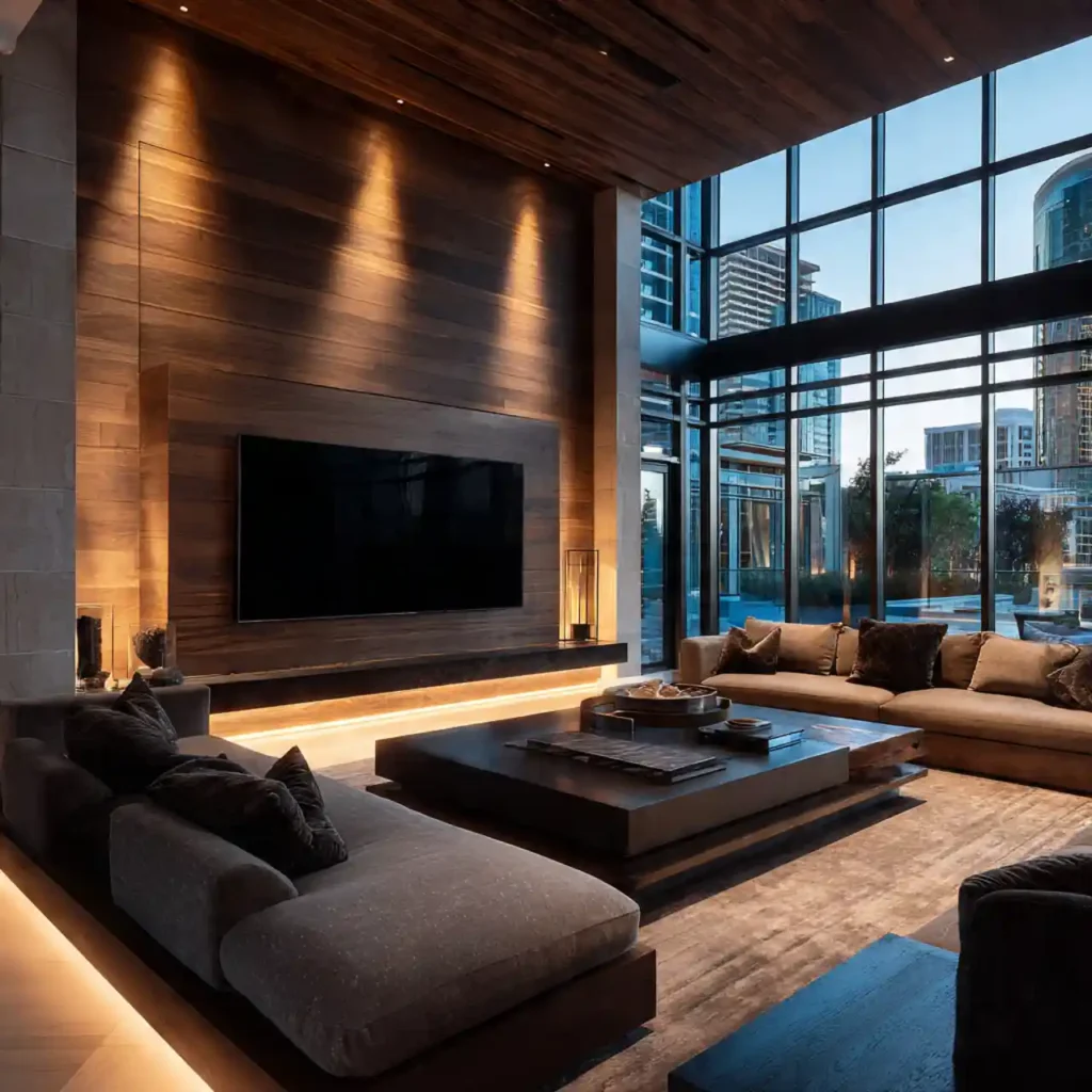Hotel-inspired TV walls often combine panels, lighting, and storage. The design looks sleek and carefully planned. Neutral tones create a calm and sophisticated atmosphere. Hidden lighting adds warmth and elegance. This style transforms the living room into a luxurious space.