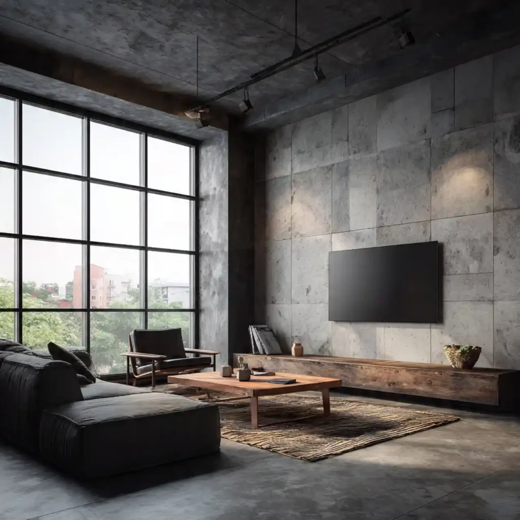 Concrete TV walls create a bold modern industrial look. The raw texture adds a unique character to the space. Soft lighting can warm up the cool surface. Minimal furniture pairs well with this design style. The result is a stylish contemporary living room.