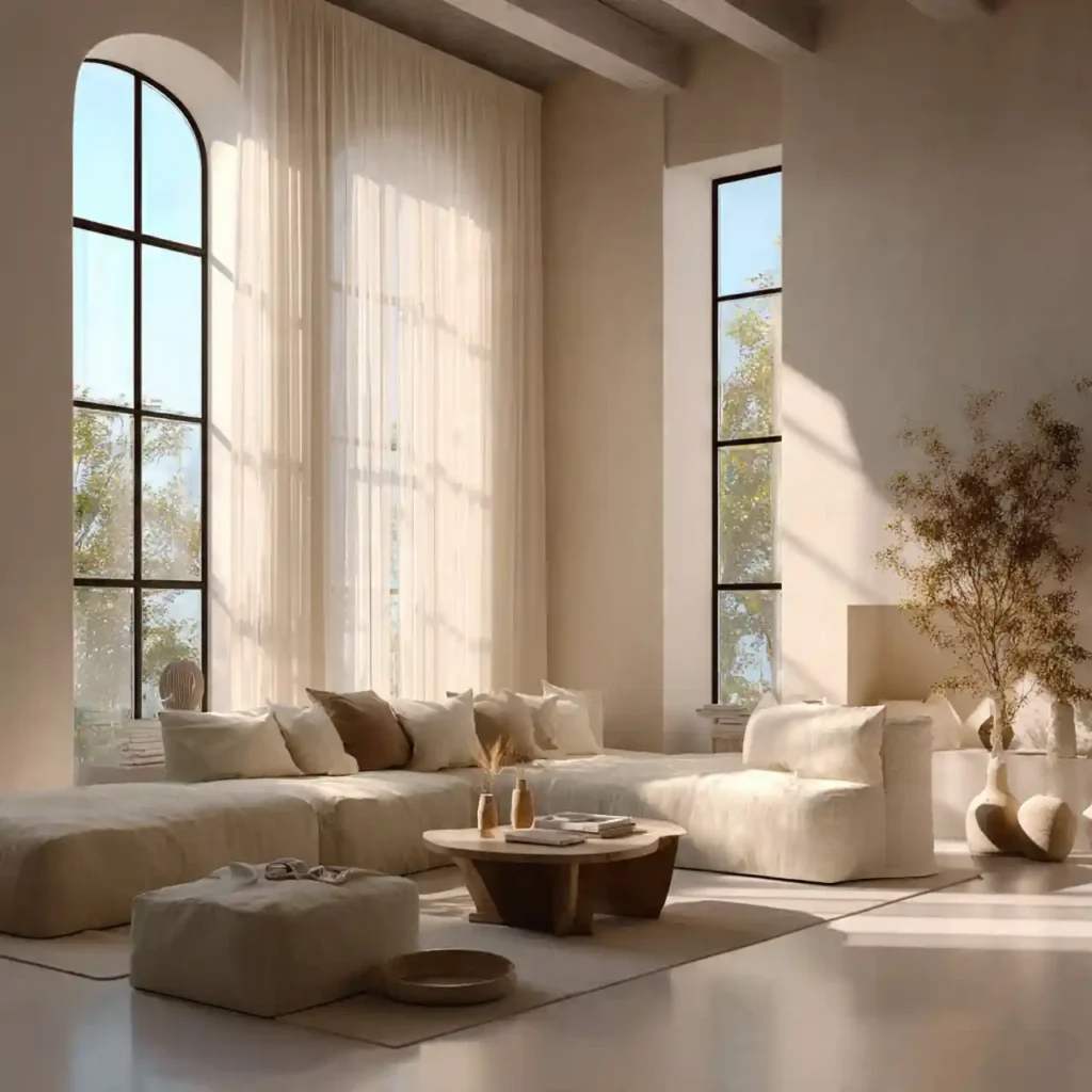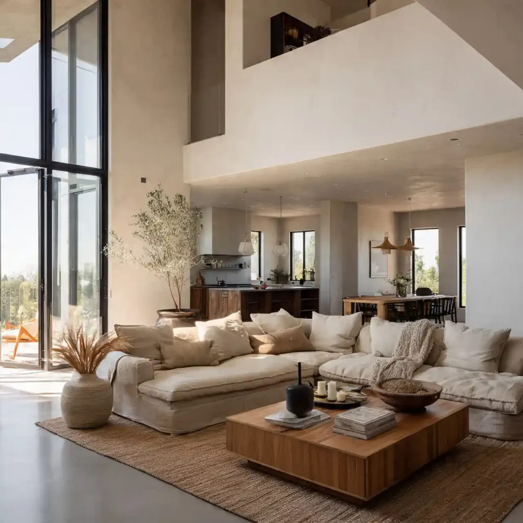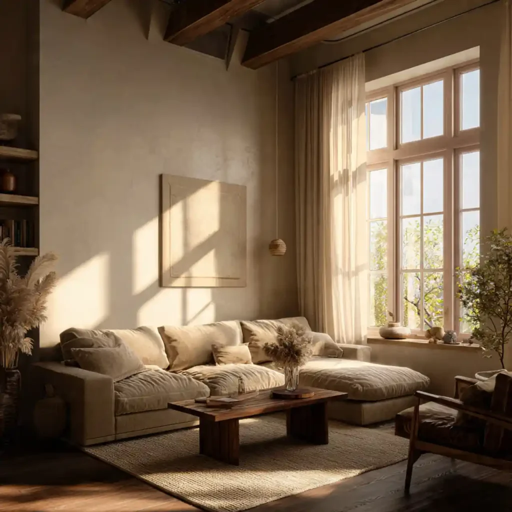 A living room filled with warm neutral tones and golden sunlight creates a comforting glow. The soft light changes throughout the day, making the space feel alive. Natural materials like wood and fabric add warmth and authenticity. The open layout enhances the feeling of calmness. This space feels like a slow, quiet moment frozen in time.