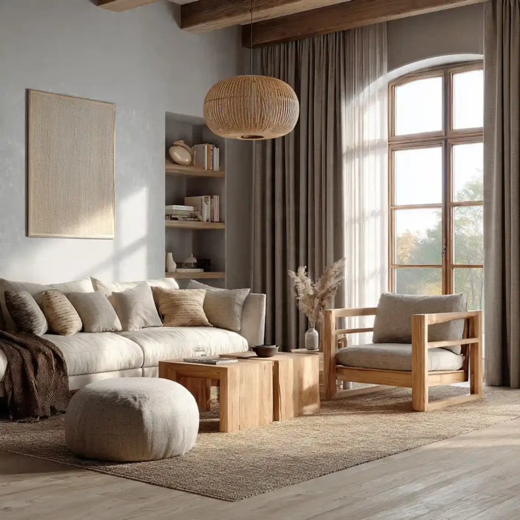 Combining light wood with soft linen fabrics creates a warm and cozy atmosphere. The materials feel natural and comforting. Neutral colors keep everything balanced. Soft textures enhance relaxation. This home feels simple yet deeply beautiful.
