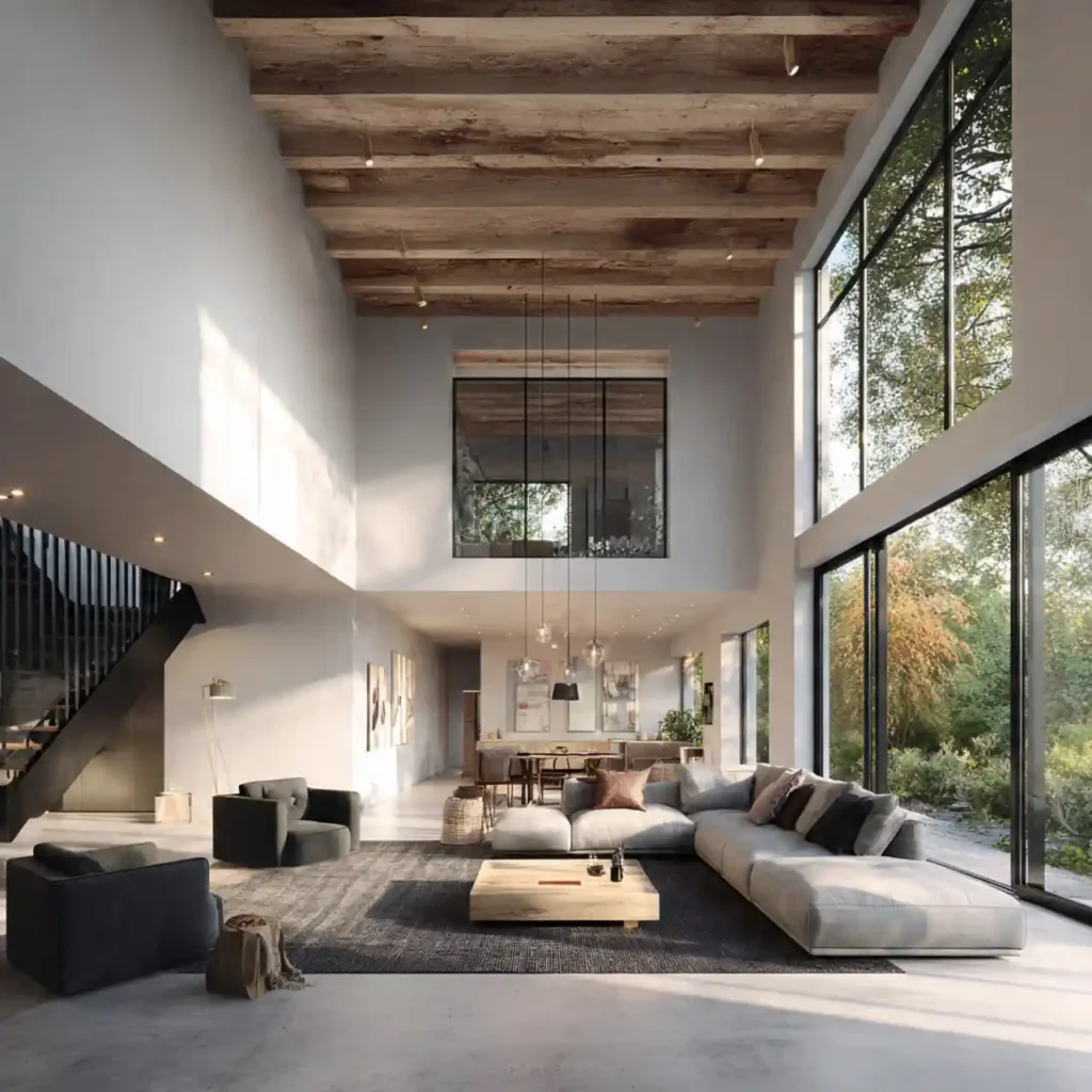 A higher or open ceiling creates a sense of freedom and space. Natural light flows more easily throughout the room. The openness reduces visual heaviness. Minimal decor keeps the space clean. This home feels light and breathable.