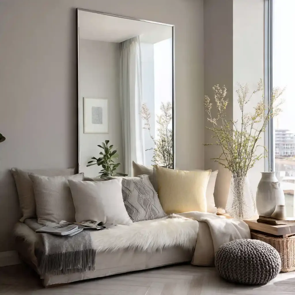 Mirrors placed thoughtfully create depth and light reflections. They make the space feel larger and more open. Simple frames keep the design clean. Natural light enhances the effect. This home feels airy and expansive.