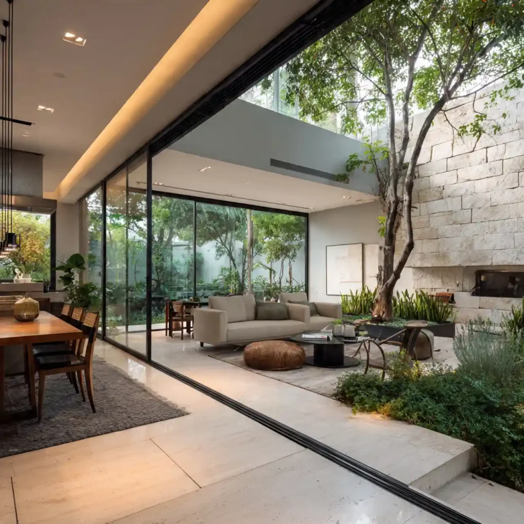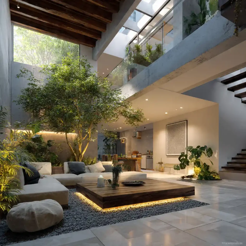 A small indoor courtyard brings nature into the heart of the home. Plants, light, and open space create a refreshing atmosphere. The design feels private yet connected to nature. Natural textures enhance the peaceful mood. This home feels like a hidden retreat.
