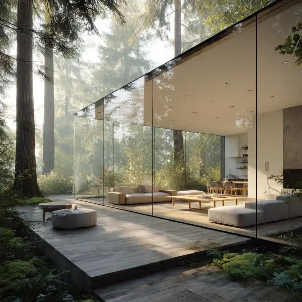 A home with full glass walls connecting to nature creates a seamless indoor-outdoor experience. Trees, sky, and light become part of the interior. The boundary between inside and outside disappears completely. Natural views bring a constant sense of peace. This design feels like living inside a dream landscape.