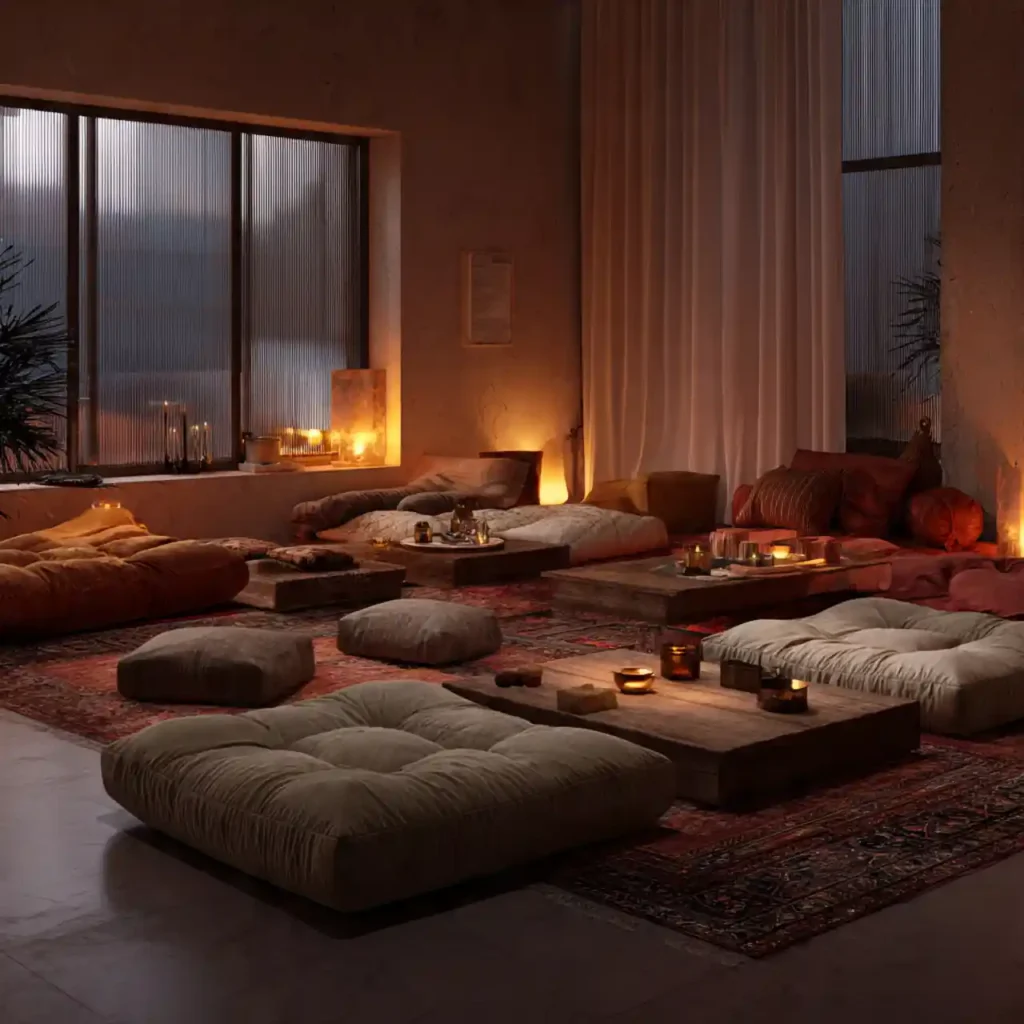 A low seating arrangement with soft cushions creates a grounded and intimate atmosphere. The closer connection to the floor feels calming and relaxed. Neutral fabrics enhance comfort without distraction. Soft lighting adds warmth during evenings. This space feels quiet, cozy, and deeply personal.