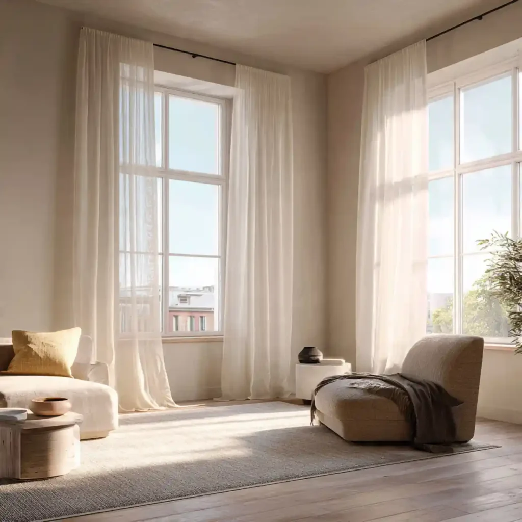 Light, sheer curtains gently moving with air create a soft and dreamy visual effect. Sunlight passing through fabric creates beautiful shadows and glow. The movement adds life without noise. Neutral tones keep everything calm and balanced. This space feels soft, airy, and almost magical.